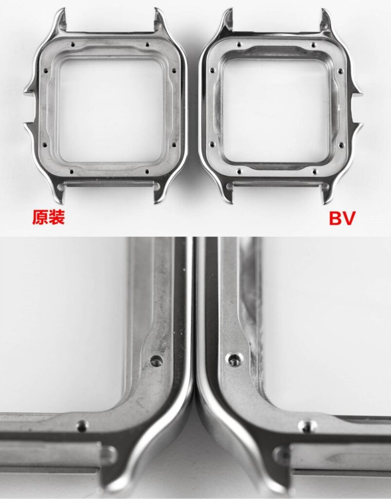Case Shape and Thickness: The case shape of the new Cartier Santos isn’t just a simple square; the curves where the four corners and lugs meet are very subtle. Through precise CNC molding, BV factory controls the case thickness to an impressive 9.08mm (large model) and 8.83mm (medium model), exactly matching genuine specifications. This ensures that unique comfortable fit on the wrist and the elegant thinness when viewed from the side – something many earlier versions couldn’t achieve.