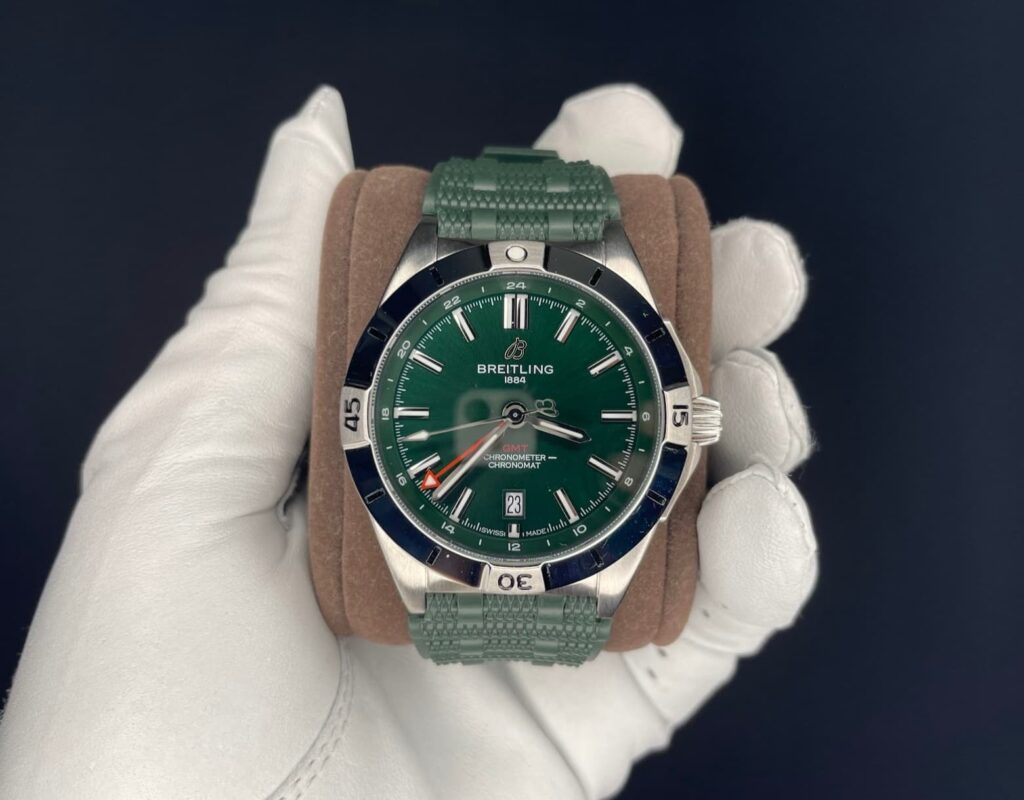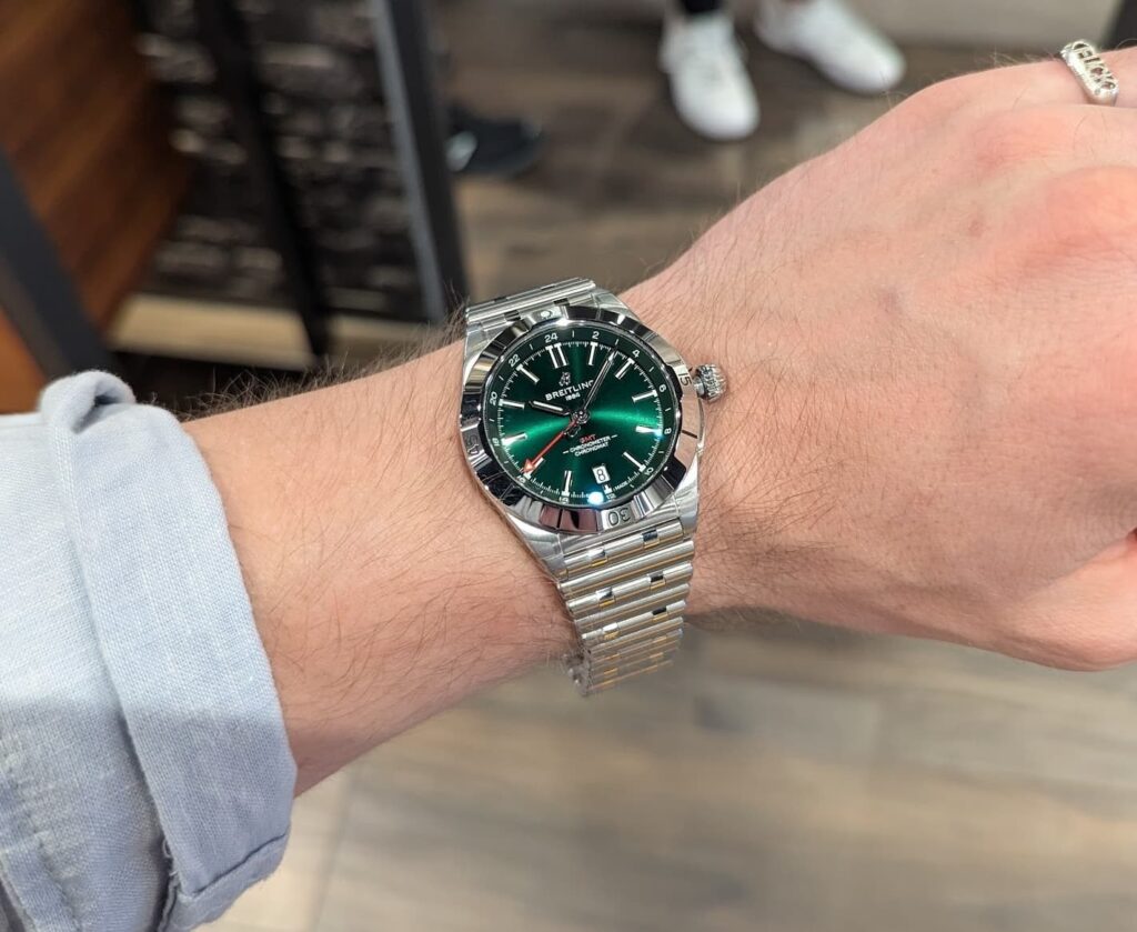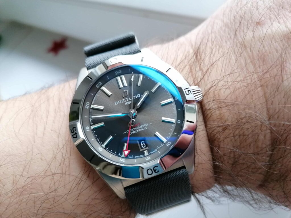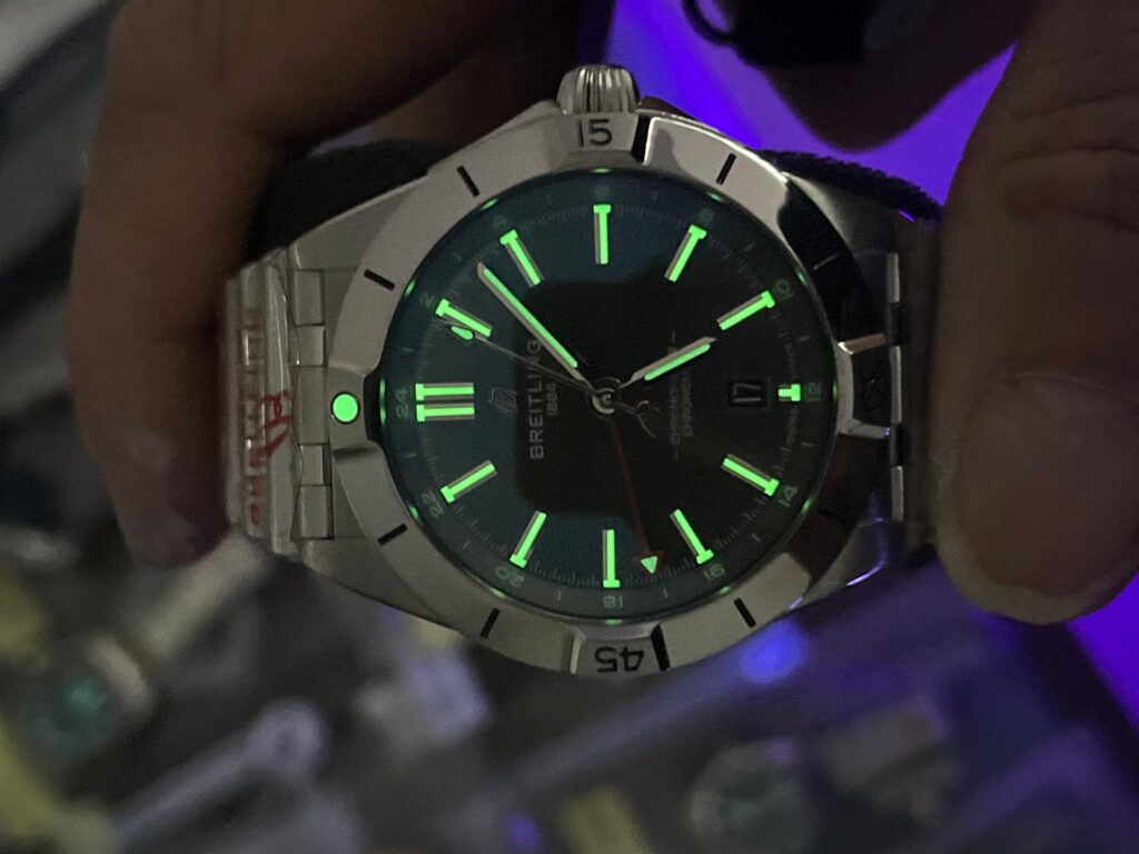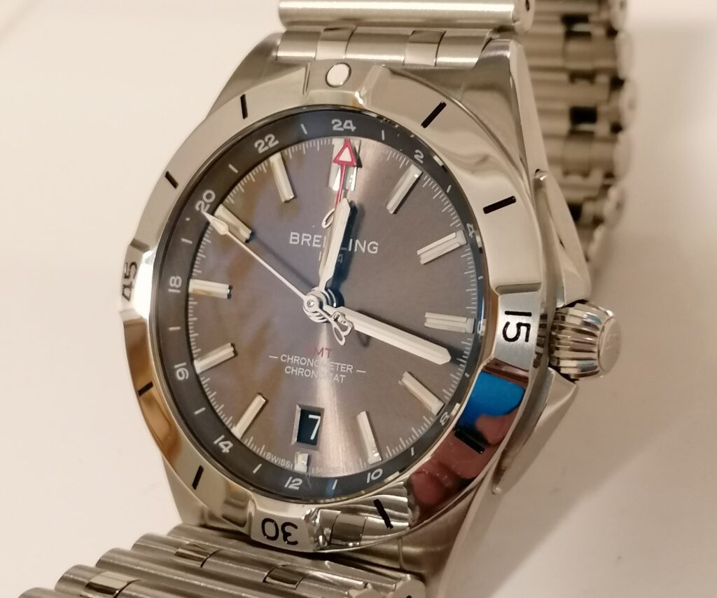 The BLS factory Breitling Chronomat uses the same GMT movement as the gen, with a quick-set date function.