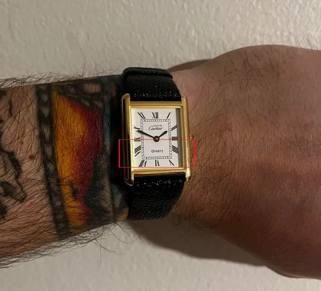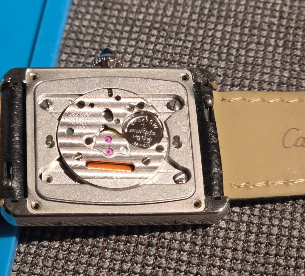 The reason that $7 watch got roasted online boils down to two details: The dial had “Quartz” printed right on it, which legit Cartier never does; and the blue cabochon on the crown was flat and dull, missing the translucent oval curve of the GEN. That’s the classic profile of a hundred-dollar fake—they just grab the broad strokes of a square case and Roman numerals and cheap out on the rest.