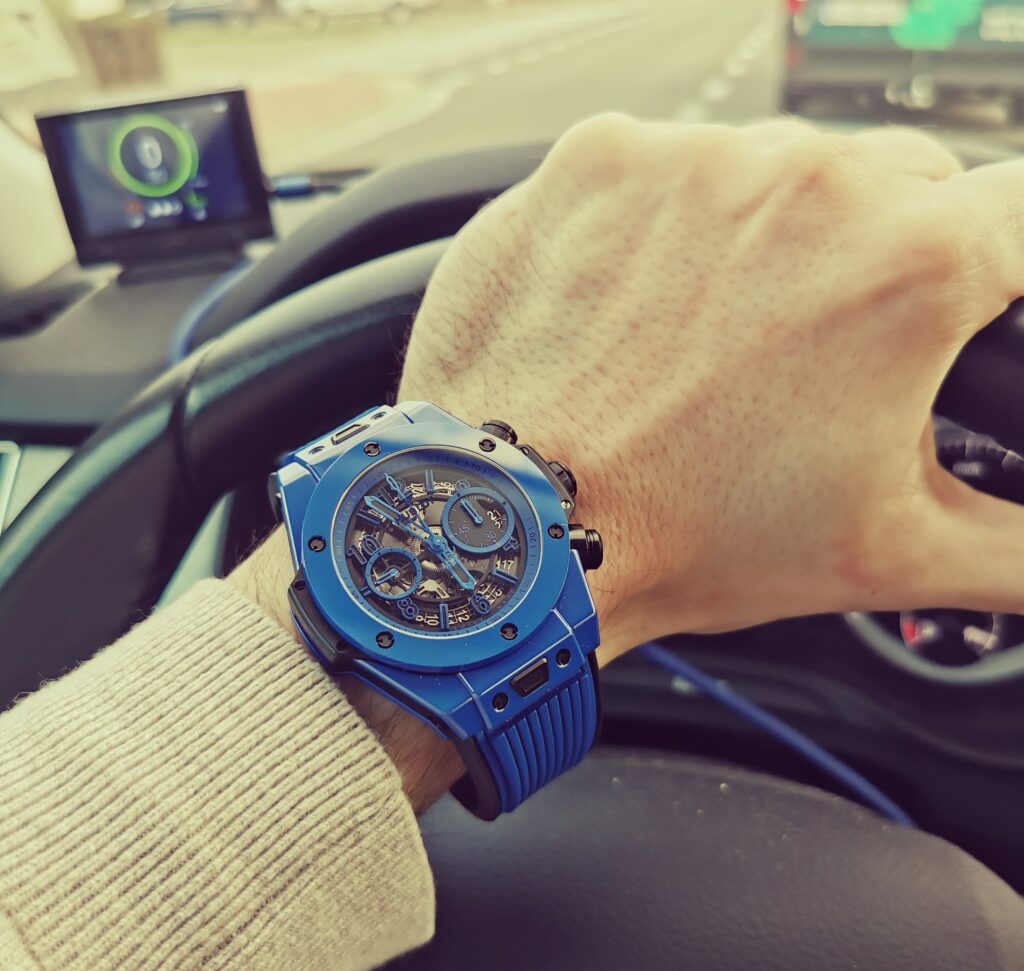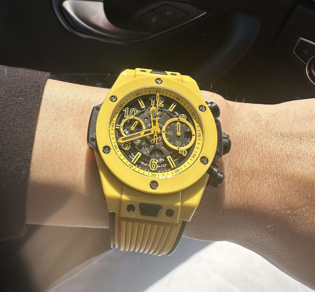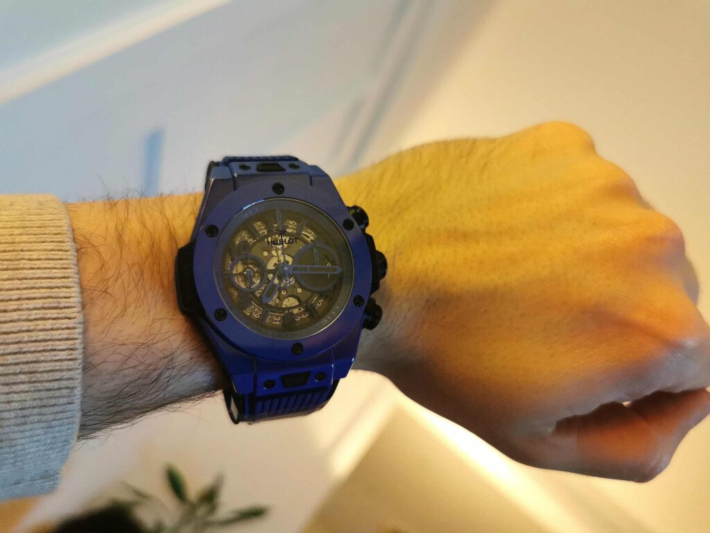 After quickly measuring it, the bezel diameter is around 42-43MM. It keeps that signature Hublot Big Bang masculine look, but doesn’t feel as bulky on smaller wrists as the original 45MM version. My wrist is about 17CM around, and when I wear it, the lugs don’t stick out past my wrist—fits pretty comfortably.