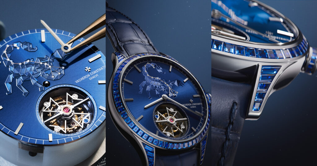The design of this one really caught my eye. It’s based on the concept of the twelve zodiac signs. The whole watch is in blue tones, symbolizing the night sky. The bezel is fully set with blue diamonds, representing the shining stars. The dial features various constellation patterns, and at 6 o’clock, there’s a cool flying tourbillon. I think it’s hard for anyone to resist owning a real rotating tourbillon replica watch that features their own zodiac sign.
