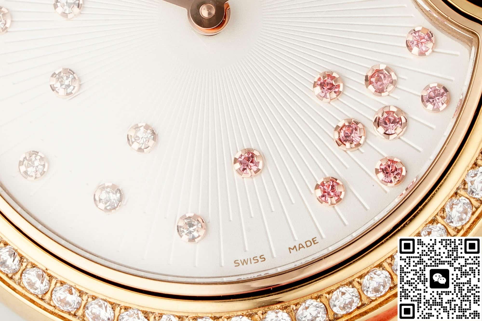 这款手表最特殊的一个地方就是没有时标刻度,但是这并不代表这款手表是个装饰品。它是可以正常使用的,虽然在艺术层面上,这样的设计是非常大胆的想法,看起来就让人眼前一亮,但是却也改变不了它不能精准显示时间的事实。因为不具备时标刻度,所以佩戴者在查看手表的时候只能按照时针和分针的大概位置来判断时间。不过虽然是这样,但这款手表的质量还是可以的。它主要使用了316L精钢镀玫瑰金色,这种材质是应用在很多手表上的。因为这种材质的成本相对较为合理,而且无论是硬度还是耐磨损程度都很好,所以外壳的质量相对来说算是过关的。表带是粉色鳄鱼纹表带,颜色与手表款式适配,而且这种材质也比较贴合手腕。尤其是AF工厂对表带的处理也是不错的,边缘被处理得平整且不磨人,佩戴手感很舒适。还有最关键的决定手表质量的因素,那就是手表使用的机芯。机芯维持着一块手表的基础运行,没了它就如同失去了灵魂,再怎么精细的手表也只剩下空壳。而这款手表的机芯也是可靠的,能够良好地维持着手表的正常运行。