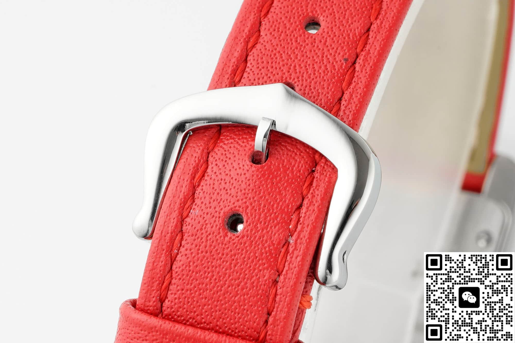 这款手表是比较有特色的那种,款式与普通手表很不一样。它的表盘不是常规的圆形,而是长方形。34.80x 19.00毫米的表径尺寸让这款手表看起来显得很修长,佩戴在手上也是很贴合的,而且显得手腕很细。它的表壳厚度只有6.50毫米,是一款十分轻便的手表,戴久了也不会觉得手腕沉重酸痛。表盘是白色的,所以镌刻在上面的罗马数字时标尤其显眼。不同于普通手表的分钟刻度,这款手表的刻度没有在边缘,而是在中间镌刻了一圈方形刻度。指针的长短设计得恰到好处,可以重叠在刻度上,精准显示时间。所以表友们也不用去担心这种刻度的设计只是为了让手表更好看,而导致最后成了一种摆设。手表的两端表圈打磨得很光滑,摸上去的手感是很好的,基本上看不到有什么瑕疵。AF工厂复刻这款手表还是很细节的,一眼看过去,这款手表的外壳质量真没得说。时标刻度镌刻清晰、表壳仔细打磨抛光,红色的表带也严格经过处理,边缘不会磨损手腕。总体来说,这款高仿手表的还原程度是非常高的,仔细去对比也没看出来这款手表和正品有什么区别。