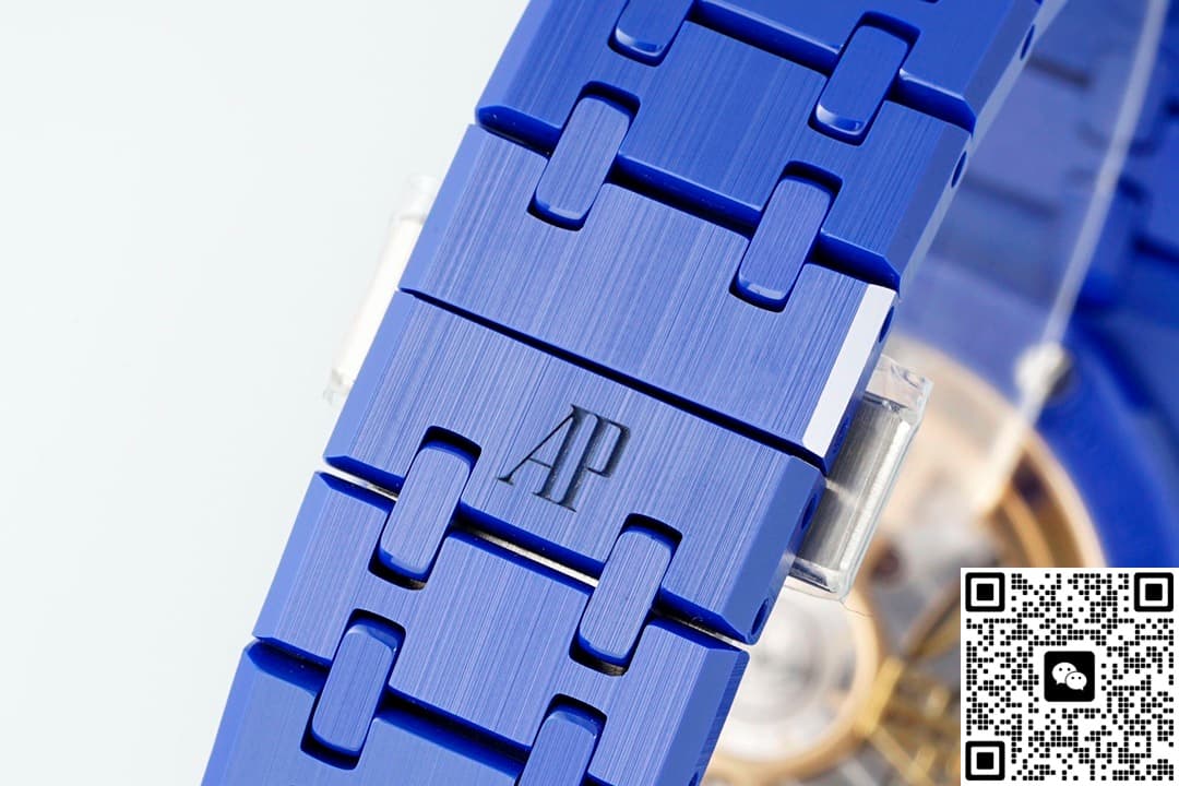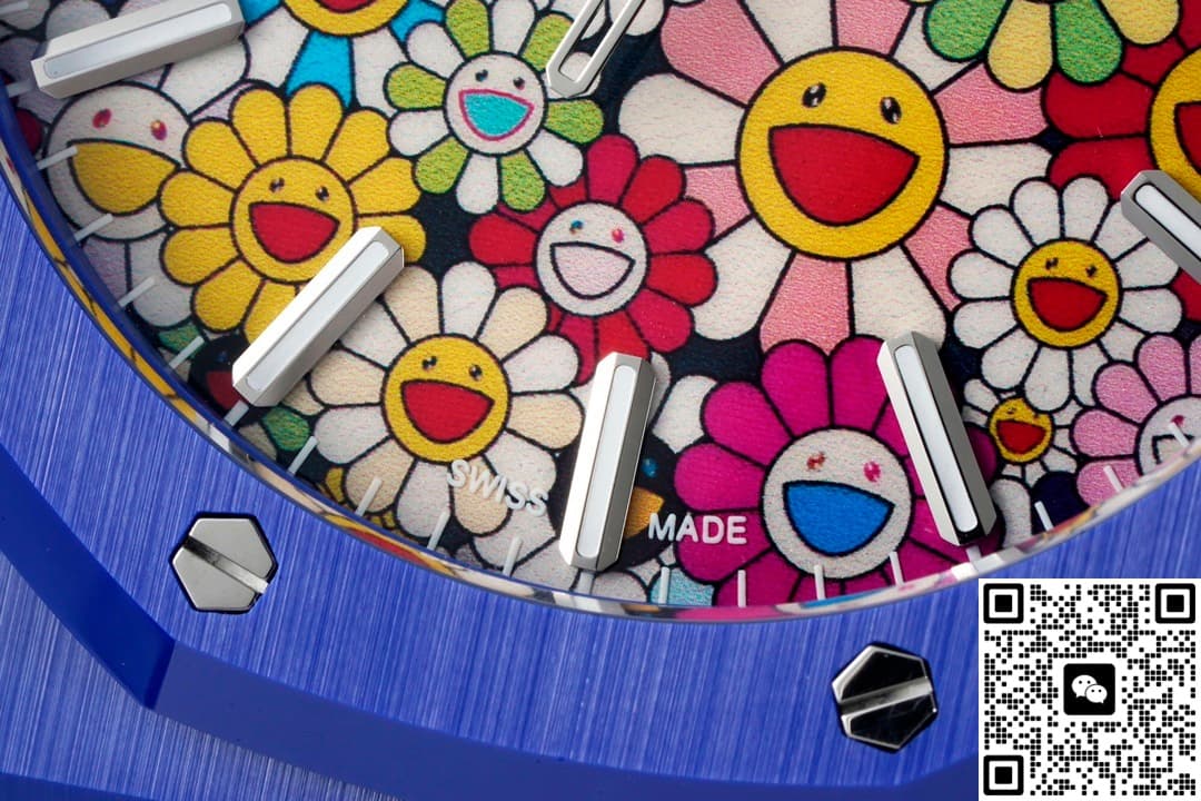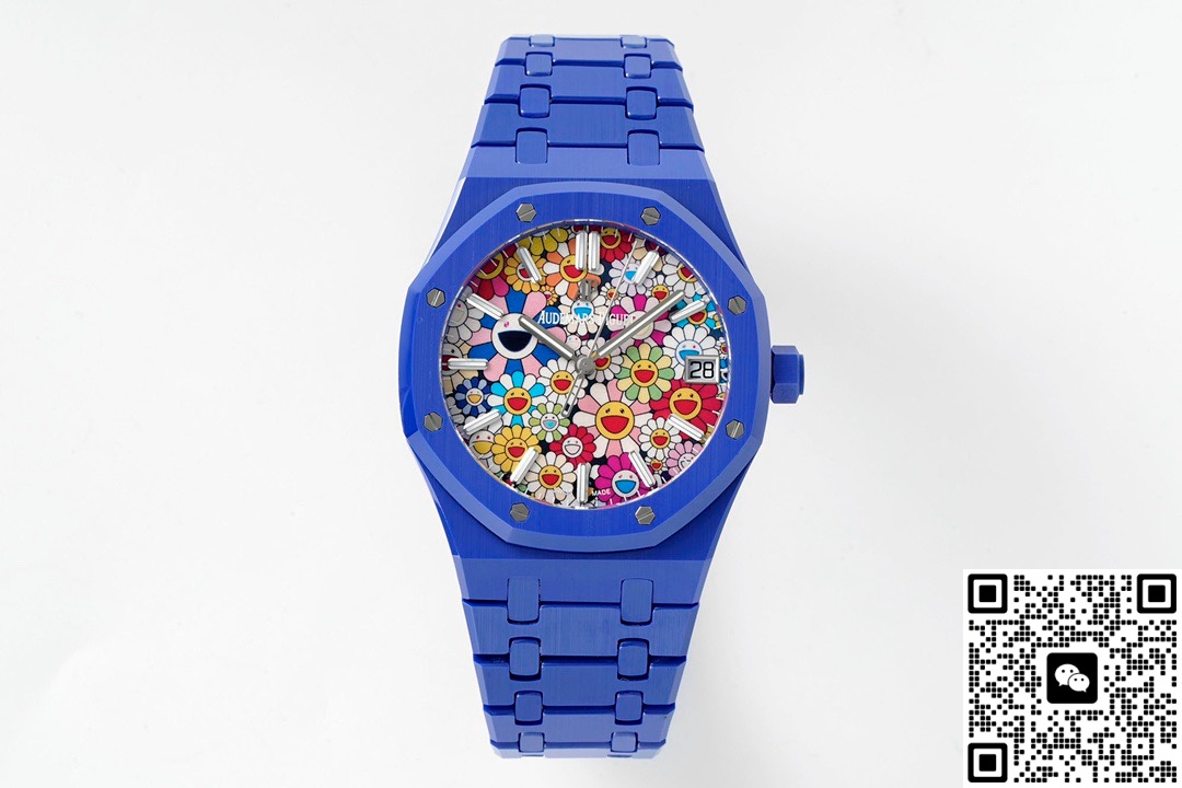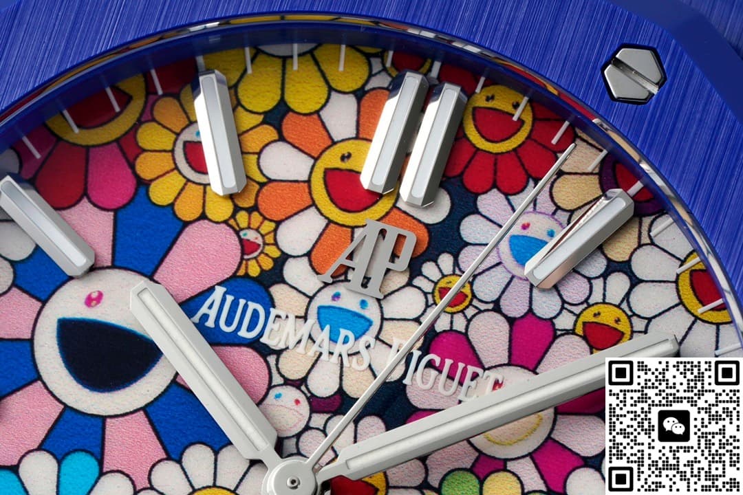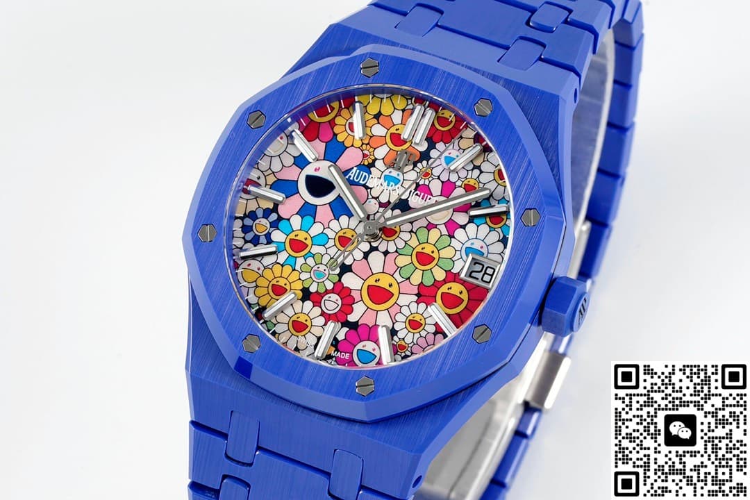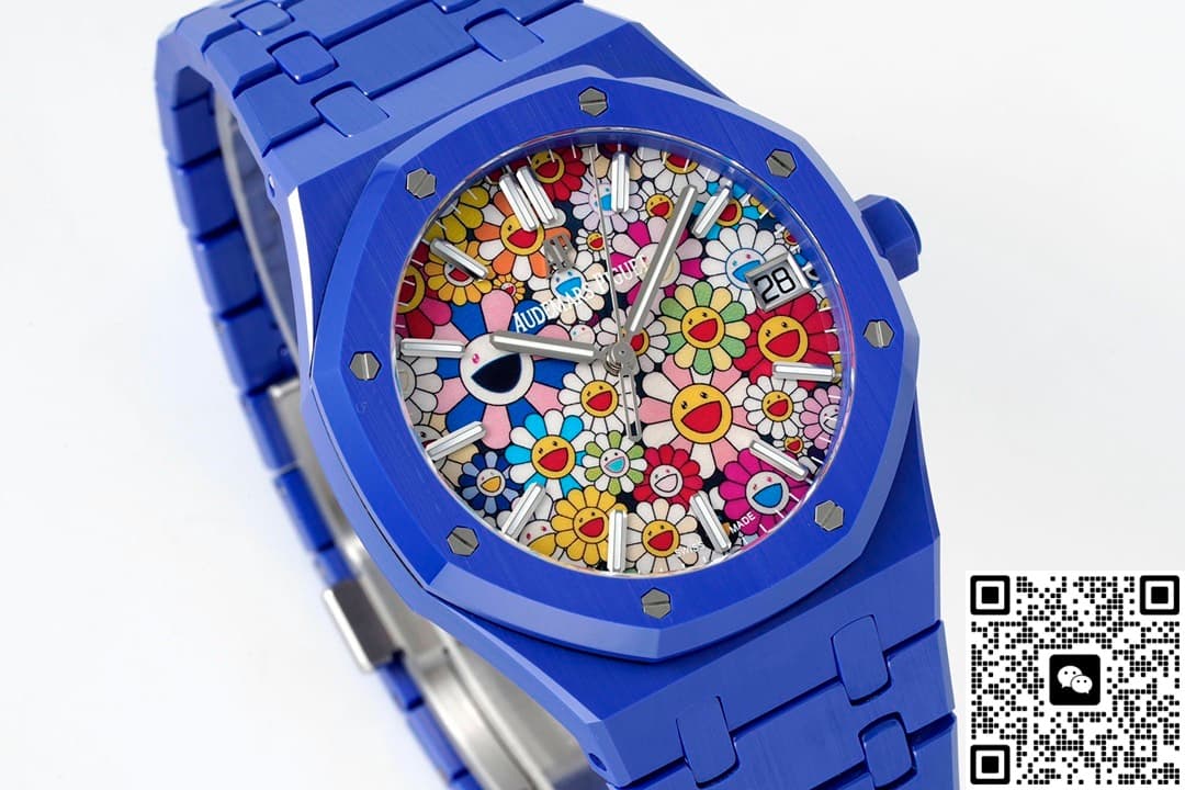 表友们都知道,爱彼的手表风格各有不同,但皇家橡树系列腕表都是一样的版型。虽然说是一样的版型,但是这个系列的手表依旧出了很多热门,让人不得不惊叹。APS工厂的爱彼皇家橡树15500高仿手表制作了新颖的手表风格。这款手表保留了爱彼的手表外型,在这个基础上创新出了新的内容。不同于一般手表的成熟风格,它看起来可以让人感到惊诧。这款手表拥有着一款太阳花表盘,上面的图案紧密结合。每一朵太阳花的形状相同、大小各异,而且配色也是各有各的风格。这样的表盘是比较复杂的,但是APS工厂的制作工艺很好。图案的每一根线条都制作得无比清晰,丝毫不会晕染或者是模糊。在表盘的边缘还有着几乎看不见的分钟刻度,棒状时标是切割细致的仿钻,表盘的正右方还有个日历窗。你一眼看上去就能发现,这是一款很活泼而且可爱的手表。这款手表的表带是蓝色的,就像小朋友在纸上描画的天空颜色,看起来浓郁又漂亮。