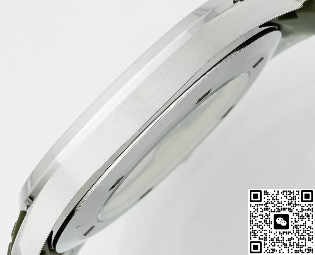 APW工厂百达翡丽高仿手表质量怎么样,看我下面的介绍就可以大致了解清楚。表壳的材质一共分为两层,最外层使用的是316L精钢材质,而内胆则是使用钨铜合金,表扣同样使用的是316L,整表称重115g,和正品的差距仅仅15g,这也是由于它表扣的材质使用的和正品的不一样,正品使用的是18K白金,不过整体重量对比其他工厂的来说算是最高的,上手份量感也很足。不管是中壳,圈口还是底盖全部是用正品3D反求,APW工厂把厚度压到8.3MM,和正品的8.25MM肉眼看简直难以分辨,穿衬衫也可以滑进袖口里,在视觉上显得更爆了。CNC之后APW工厂还会使用缎纹和抛光交替打磨,在圈口正面水平缎纹,之后从侧面镜面抛光,再倒角0.2MM,这一波操作下来整体拿在手上的手感非常圆润,而且不会搁手。APW工厂把这款百达翡丽百达翡丽Aquanaut 5168G-010的盘面还原的也不错,卡其绿色是APW工厂单独调漆出来的,2025年的批次比3K工厂暗个5%,就算在冷白LED灯光下面也不会变成翠绿跳色。盘面上的刻度是独立冲压的18K镀层,之后在顶部填充瑞士C3夜光粉,夜光的边缘也非常整齐没有溢出的现象。三点位的日历框和正品一样使用台阶形切削,就算放大十倍也看不到白边,不像其他低端高仿工厂一样是简单打孔。表带材质则是完全的新升级,使用的是Tropical复合胶,在2025新配方里边加入了8%的医用级氟橡胶,这种材质在-20°C的时候不会发硬,80°C的环境也不会回粘,放在海水里面浸泡一周也不会变色。
