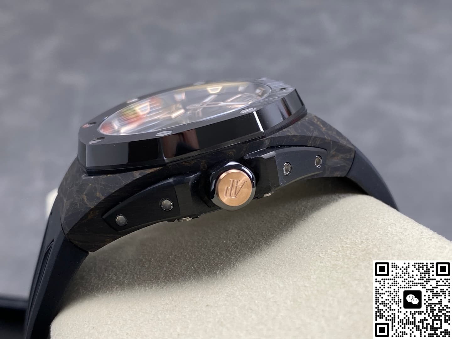 这是一款拥有着42毫米的表径、15毫米的表壳厚度的手表,这个数值可以说明它适用于很多人。不知道表友们有没有注意到这是一款浮动式陀飞轮手表。这是一个复杂的调速装置,它的独特之处在于它的框架组装时没有安装上层桥板,看起来让人觉得有种失重的感觉,而且腕表的内部结构一般都是展露出来的。这种设计让手表更加美观,提高了走时的精准率和抗震性能,是一种创新的设计。它拥有着碳纤维树脂混合表壳,紧密保护着手表的内部零件,在外观上也显得好看,是一种不错的材质。表圈由黑色陶瓷制作而成,光泽感显得手表更加好看,也不容易发生磨损什么的。蓝宝石表镜有着清晰的显示能力,同时也起到了保护的作用。最能体验佩戴手感的就是表带了,这款手表使用的是橡胶表带,柔软的材质处理得当,戴久了也不会损伤皮肤。不过要说质量,就不得不提到手表的机芯。这款手表采用的是Calibre 2978陀飞轮克隆机芯,比起其他机芯要更适合这款手表。机芯的质量也是可靠的,展现出来的性能基本上没有什么太大的瑕疵,可以支撑手表正常运作。从手表的材质和机芯两方面推测,可以看出来手表的质量还是很不错的。