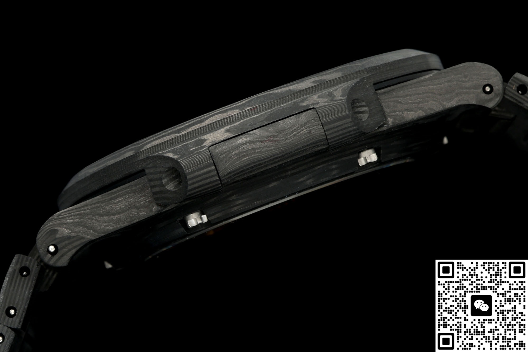 那DIW工厂碳纤维高仿手表工艺怎么样呢?DIW工厂的碳纤维表壳并不是碳壳套钢芯的那种半吊子,中层表壳和表圈都是100%的NTPT级别碳纤维,DIW工厂把400层0.05MM碳布用树脂预浸,热压罐135°C后用CNC一体铣出壳型,再手工倒角,最后DLC黑度层拉丝,把壳身减重了42%,抗拉强度确实钢的5倍,而且耐盐雾,耐汗液腐蚀,就算海边戴也不怕。表盘使用的材料是0.3MM厚度锻造碳纤维薄板和黄铜基底复合,在业内叫做Forged Carbon Dial,先高温高压把碳丝压成块,再水刀切割,CNC挖空之后手工填平,最后用哑光UV漆封闭,保证不褪色也不掉渣,放在阳光下面会出现云纹,不会出现普通黑盘那种灰雾或者塑料感,而是像黑洞一样把光吸进去,和外壳的锻造碳纹理形成强烈的层次感,而且每块纹理都独一无二,拥有就是绝版,非常炫酷。碳纤维链节的内侧依旧套有316L精钢芯,这也是为了保证强度和螺丝的咬合度。在没有被碳布包裹的壳侧,表耳正面做了DLC黑镀层再进行细拉丝,防刮能力提升到HV1200以上,日常金属摩擦基本不会留痕。镜面为无色防反光镀膜蓝宝石水晶材质,通透度系数非常高,底盖同样是蓝宝石,可以看见机芯的运转。不过使用碳纤维材质作为表壳表带虽然轻,有设计感,但是大家也都知道,这种材质不经摔,一旦摔了,开裂那是常有的事,所以这种碳纤维改装一旦拿到手,可得好好的保护它,返厂那就是需要整壳替换的程度了。
