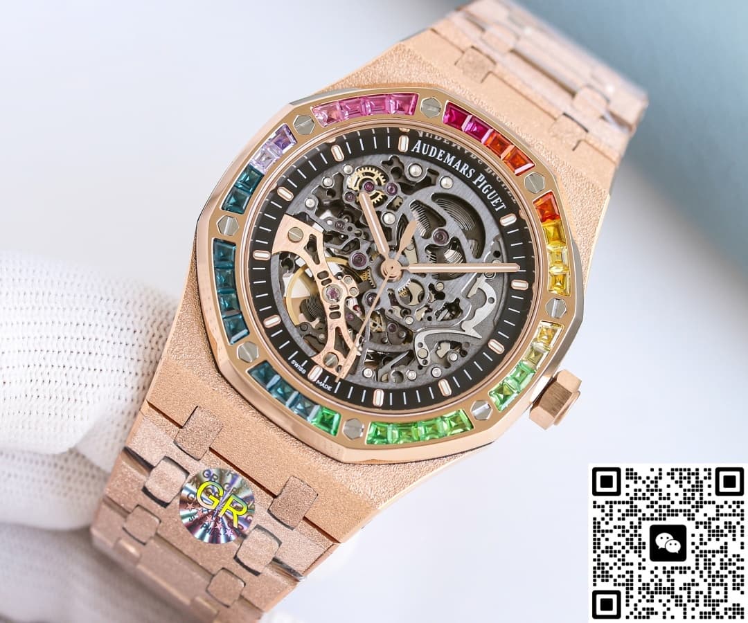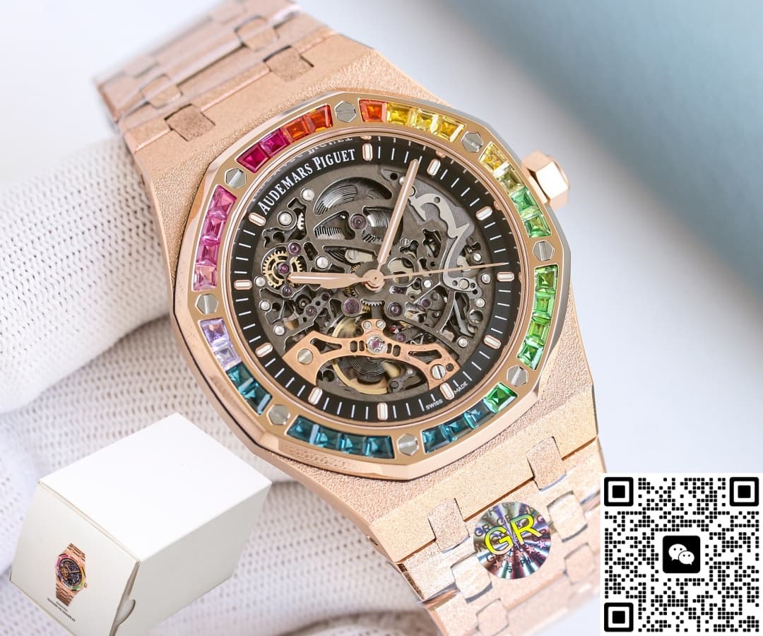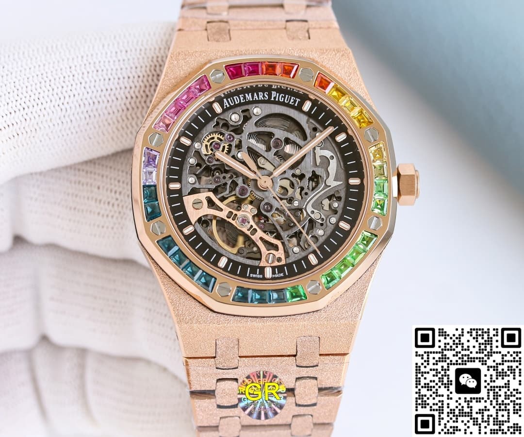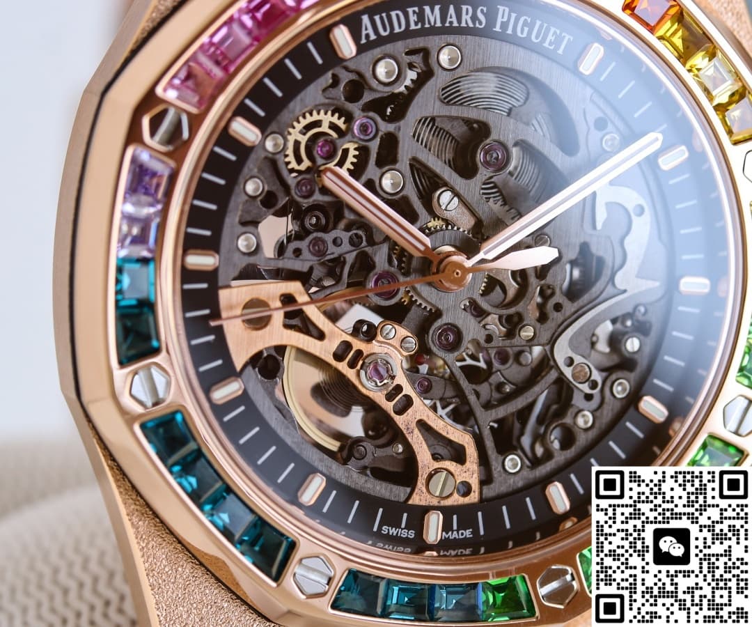 这款手表的外型非常让人惊艳,它有着独特的设计和精湛的工艺,看起来和正品一模一样。这绝对是爱彼手表里令人惊喜的一款手表,给予人的美感冲击是很强的。它有着镂空的表盘,将里面的机芯原原本本地展现出来。各种精巧的配件按照既定的轨迹运作着,恰到好处地组合又分开,共同形成了一个微缩的机械宇宙。机械零件并不都是相同的颜色,部分零件采取了和指针一样的颜色铸就,看起来不会让人觉得乏味。其实如果单看机芯的精致程度,就已经能赞扬GR工厂高端的复刻工艺了。这些零件层层叠叠组成的图案就像某种神秘的古老图腾,在展现出自己的美感。由于指针的颜色和机芯零件不同,所以视觉效果上还是很明显的,不会被层层叠叠的零件所干扰时间上的判断。另外,这款手表还附加了一圈黑色内圈,清晰地镌刻了分钟刻度和大小切割细致的棒状时标。这样一来,不像别的镂空手表那样需要细细去看,一眼就可以很直观地判断出准确的时间。表圈更是吸引人的目光,它有着爱彼标志性的八边形表圈,上面有外露螺丝。螺丝中央部分还镶嵌了不同颜色的人造宝石,看起来十分漂亮。可以说,这款手表和正品手表是没有什么区别的。