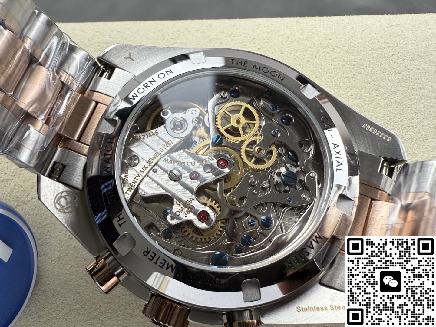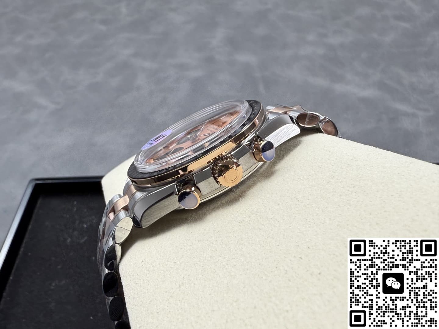 这次的超霸外观保留了第四代登月表不对称的表壳,42MM的表径加上三眼计时和测速外圈,辨识度极高。它的配色主打粉金盘,肉眼看是香槟-玫瑰金太阳纹阶梯面盘加上黑化小表盘,在日光下面呈现暖金色,弱光下面则偏玫瑰色,男女通吃。刻度和时标为条钉和圆点复合布局,条钉的顶部镀有玫瑰金并填充瑞士夜光粉,夜光是淡绿色的,亮度和正品十分接近。外圈是黑色陶瓷圈加复古刻度,字面用Ceragold填金工艺,视觉一体感强。透底为蓝宝石玻璃背透,可以直接看到机芯的夹板,镀金自动陀和Speedmaster浮雕字,仿真度非常高。
