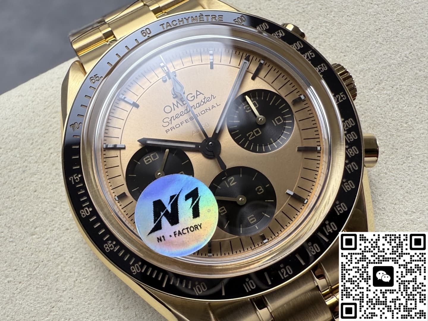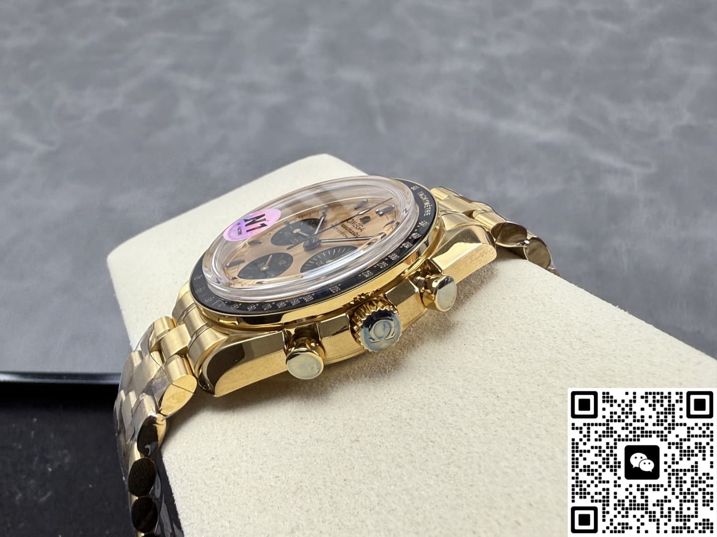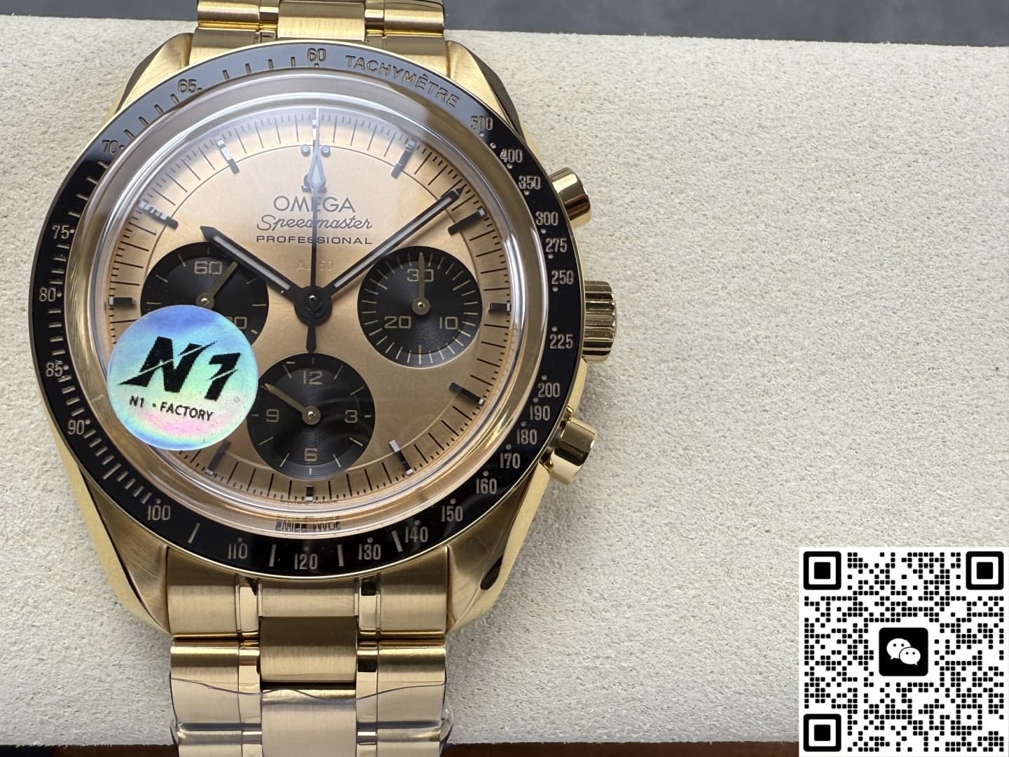 N1工厂欧米茄手工做功如何?它的表壳统一使用316L精钢材质CNC一体生成,再镀上一层8微米的厚金层,在色泽方面还原度达到95%以上,黑色陶瓷表圈也是N1工厂表现得很优秀的一个方面,它采用韩国进口的陶瓷胚料,冷等静压200MPa后成型,再经过两次烧结之后大致成型,为了让外型上跟正品更加还原,N1工厂在粗胚上CNC五轴雕出测速斜面,再第三次1400°C定型,成品的硬度1250HV,抗刮花是不锈钢的六倍,不管是在色泽还是光亮度方面都非常接近正品,不过不论是哪种陶瓷材质都有一种致命的弱点,就是脆性高,如果磕碰到了那就是必坏的结果,而且维修的话也需要整圈更换。表带同样跟表壳使用同样的工艺,在镀金之后中段抛光再两侧拉丝,整体过渡的非常自然,而且折叠扣手感也很紧实。表镜使用和正品同规格的蓝宝石水晶玻璃材质,镀有蓝紫色的膜,在侧光下可以看见浅蓝紫色的反光,这一点也跟正品一致,而且通透度达到了98%,表盘内的所有细节都可以一览无余。