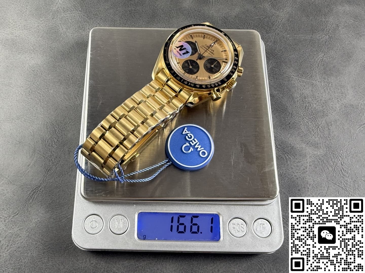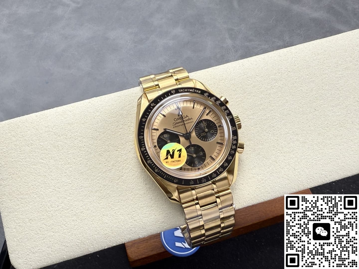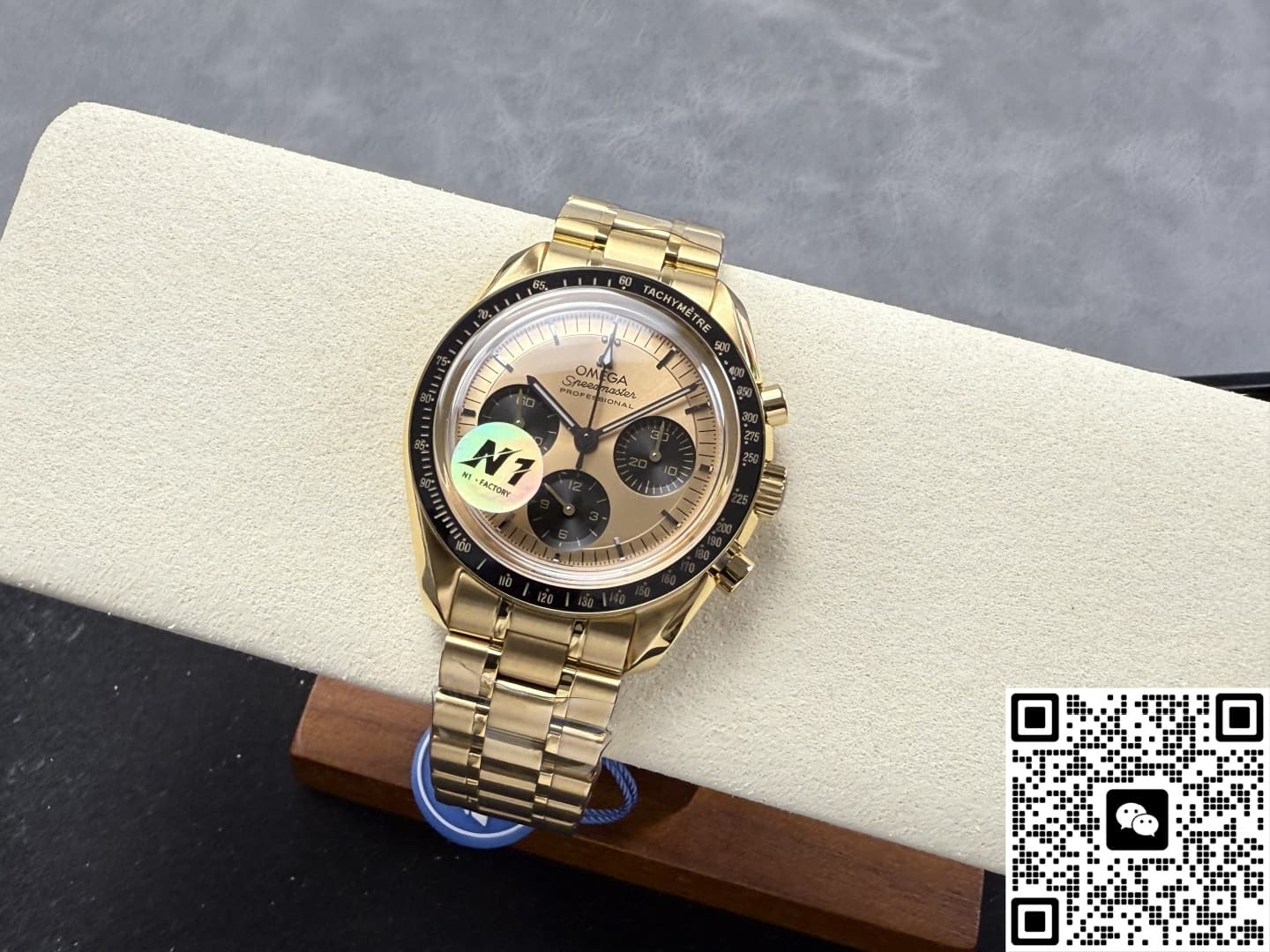 N1工厂欧米茄手工做功如何?它的表壳统一使用316L精钢材质CNC一体生成,再镀上一层8微米的厚金层,在色泽方面还原度达到95%以上,黑色陶瓷表圈也是N1工厂表现得很优秀的一个方面,它采用韩国进口的陶瓷胚料,冷等静压200MPa后成型,再经过两次烧结之后大致成型,为了让外型上跟正品更加还原,N1工厂在粗胚上CNC五轴雕出测速斜面,再第三次1400°C定型,成品的硬度1250HV,抗刮花是不锈钢的六倍,不管是在色泽还是光亮度方面都非常接近正品,不过不论是哪种陶瓷材质都有一种致命的弱点,就是脆性高,如果磕碰到了那就是必坏的结果,而且维修的话也需要整圈更换。表带同样跟表壳使用同样的工艺,在镀金之后中段抛光再两侧拉丝,整体过渡的非常自然,而且折叠扣手感也很紧实。表镜使用和正品同规格的蓝宝石水晶玻璃材质,镀有蓝紫色的膜,在侧光下可以看见浅蓝紫色的反光,这一点也跟正品一致,而且通透度达到了98%,表盘内的所有细节都可以一览无余。