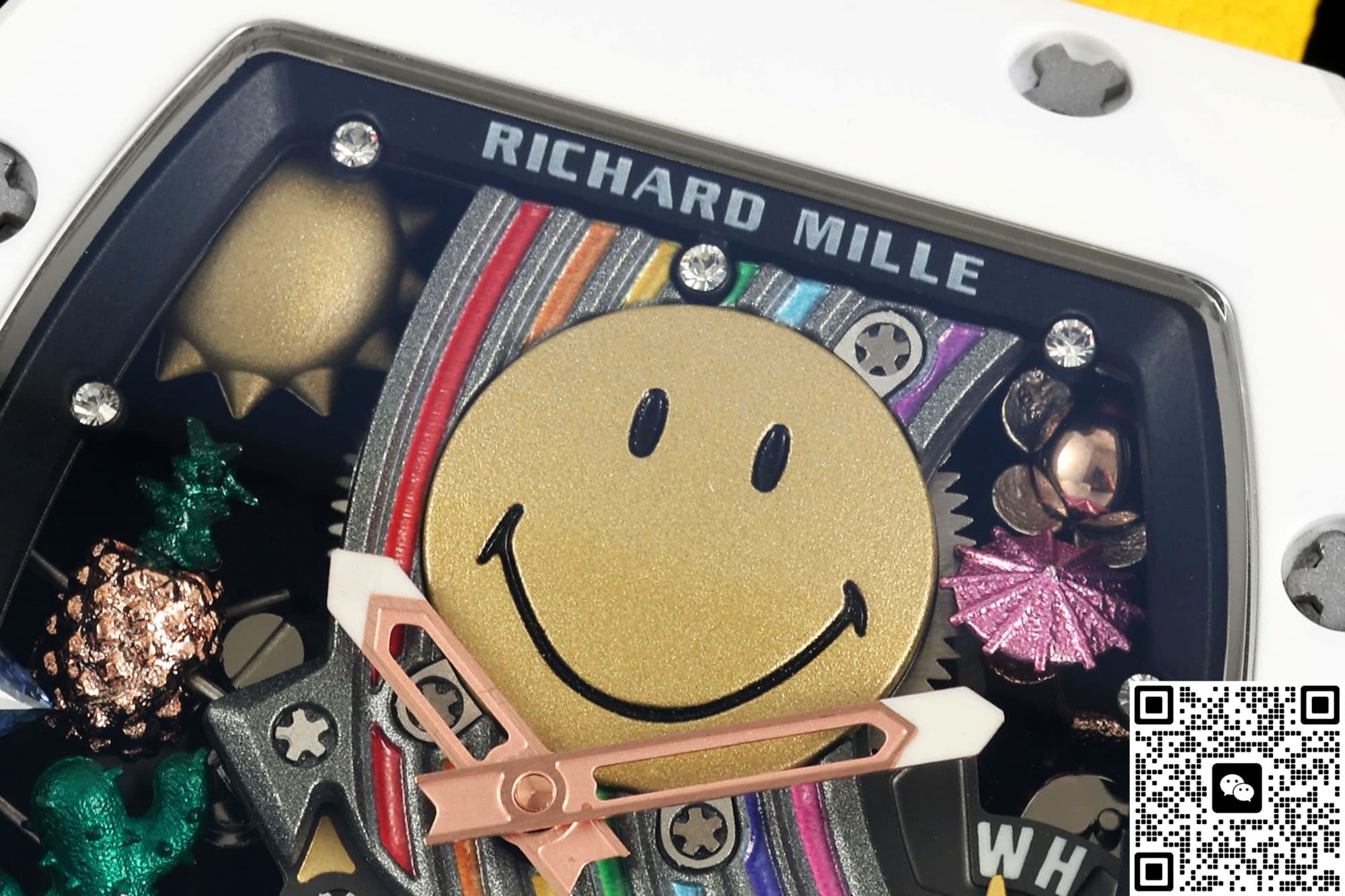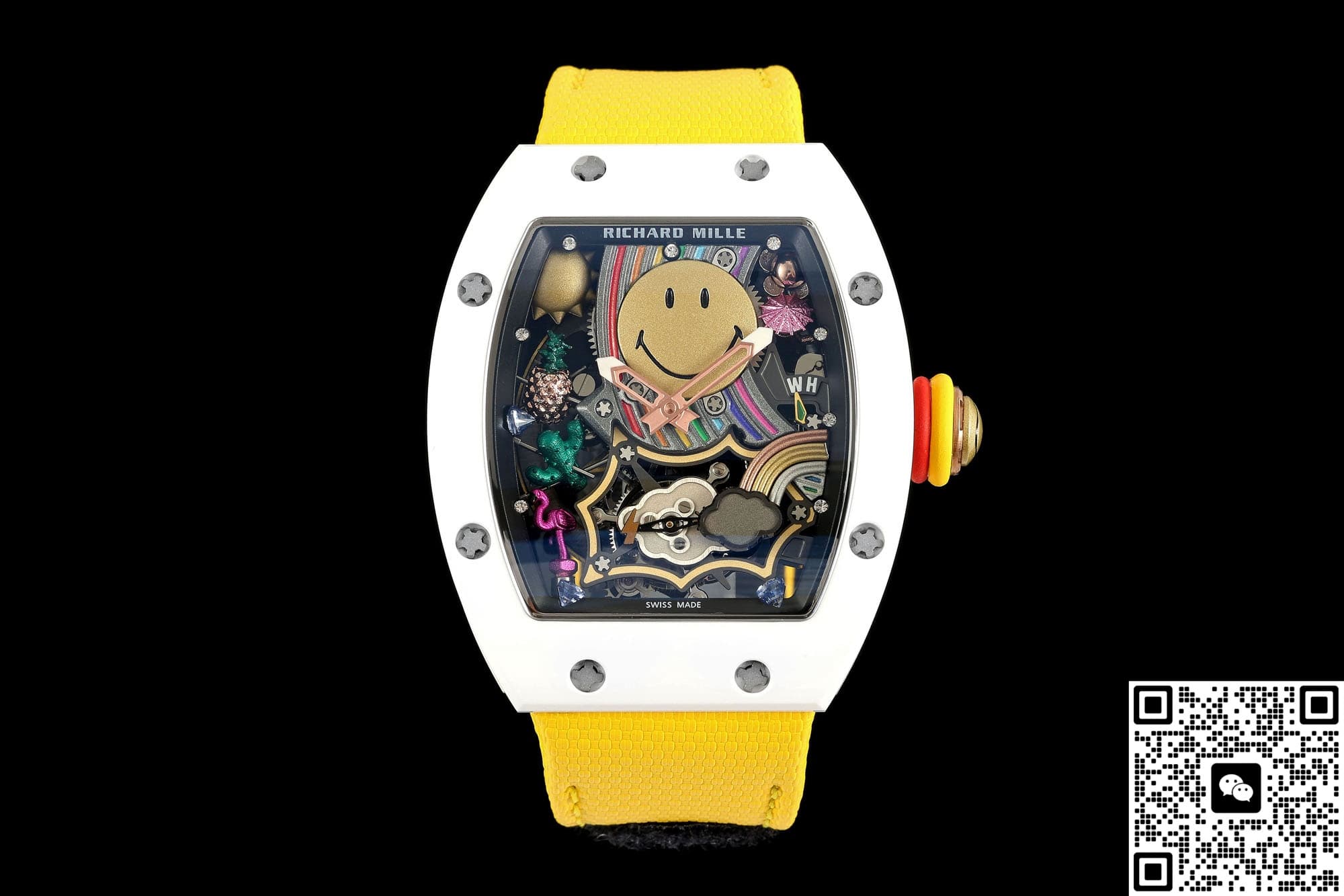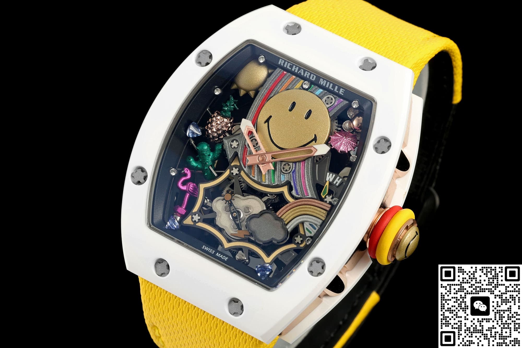 这是目前性价比最高的笑脸陀版本,表盘中央有一枚直径约12MM的立体黄金色PVD笑脸,眉毛、眼睛、嘴角都是CNC再手工打磨,远看是卡通,近看有金属的棱角,笑脸的周围做悬浮派对布局,五点位置有小彩虹桥板、六点位隐藏式陀飞轮、三点位火烈鸟、仙人掌、鸡尾酒杯等等九组微雕,视觉看过去就像漂浮在镂空机芯上方一样,原版的味道非常浓郁,酒桶型的表壳上下层都是白色ATZ陶瓷,中层电镀18K红金,表冠顶部也做了一个笑脸浮雕,白金黄整体色彩搭配起来撞色效果非常明显,走在大街上自带焦点。可能有朋友担心自己手腕不太大戴起来会不会很奇怪,其实不会的,NEW工厂这款理查德米勒RM88款虽然也是和正品一样做的48.15×39.74MM尺寸,不过酒桶型的表壳本身就带有弧度,佩戴起来很贴手腕,搭配上织物橡胶结合的表带,16-19CM的腕围都完全可以完美的驾驭住它。