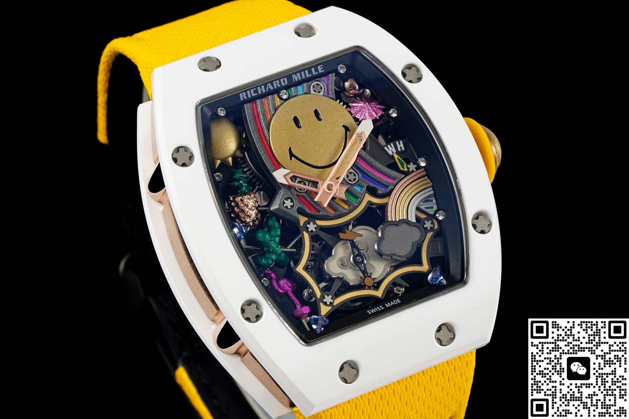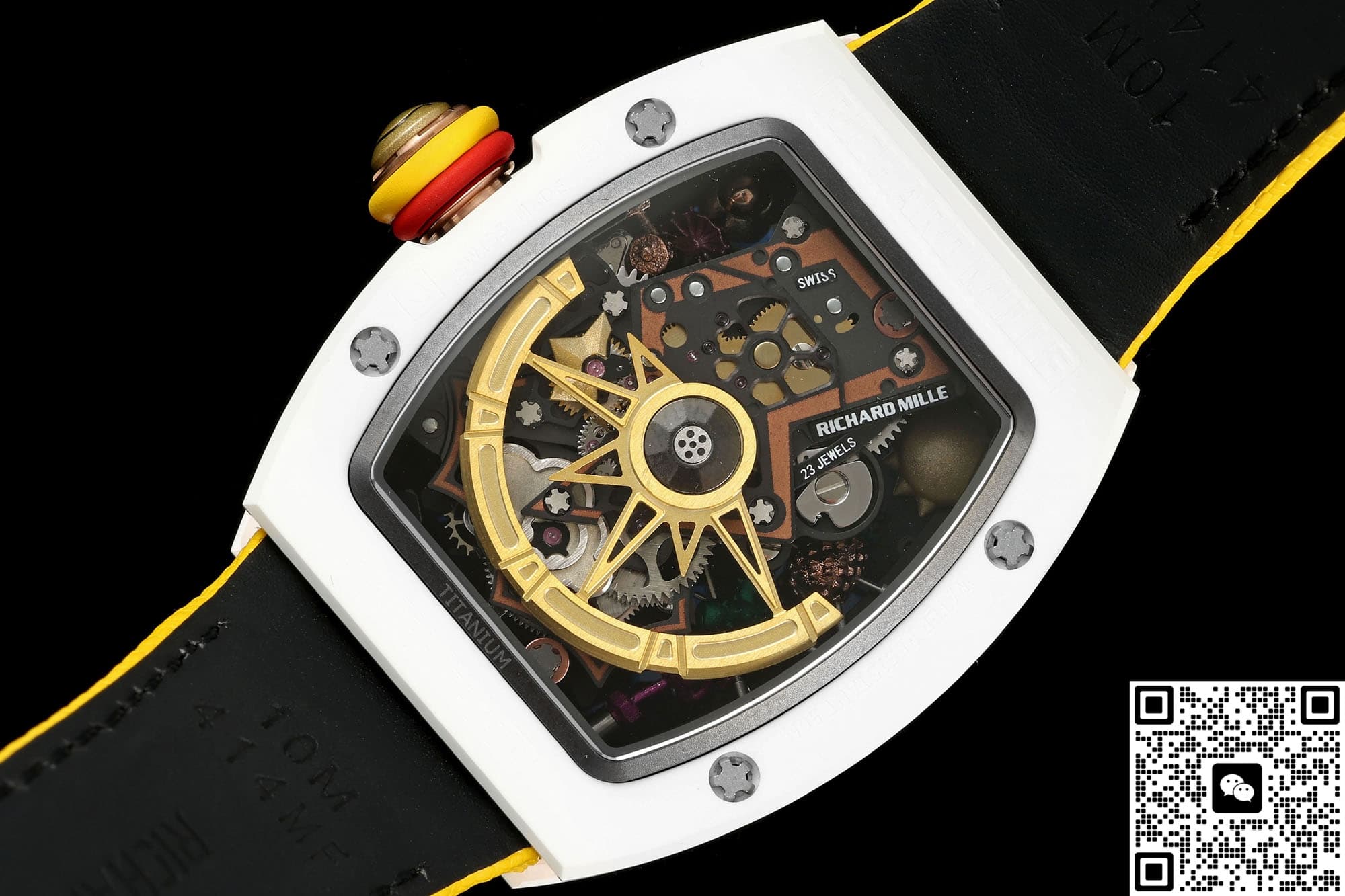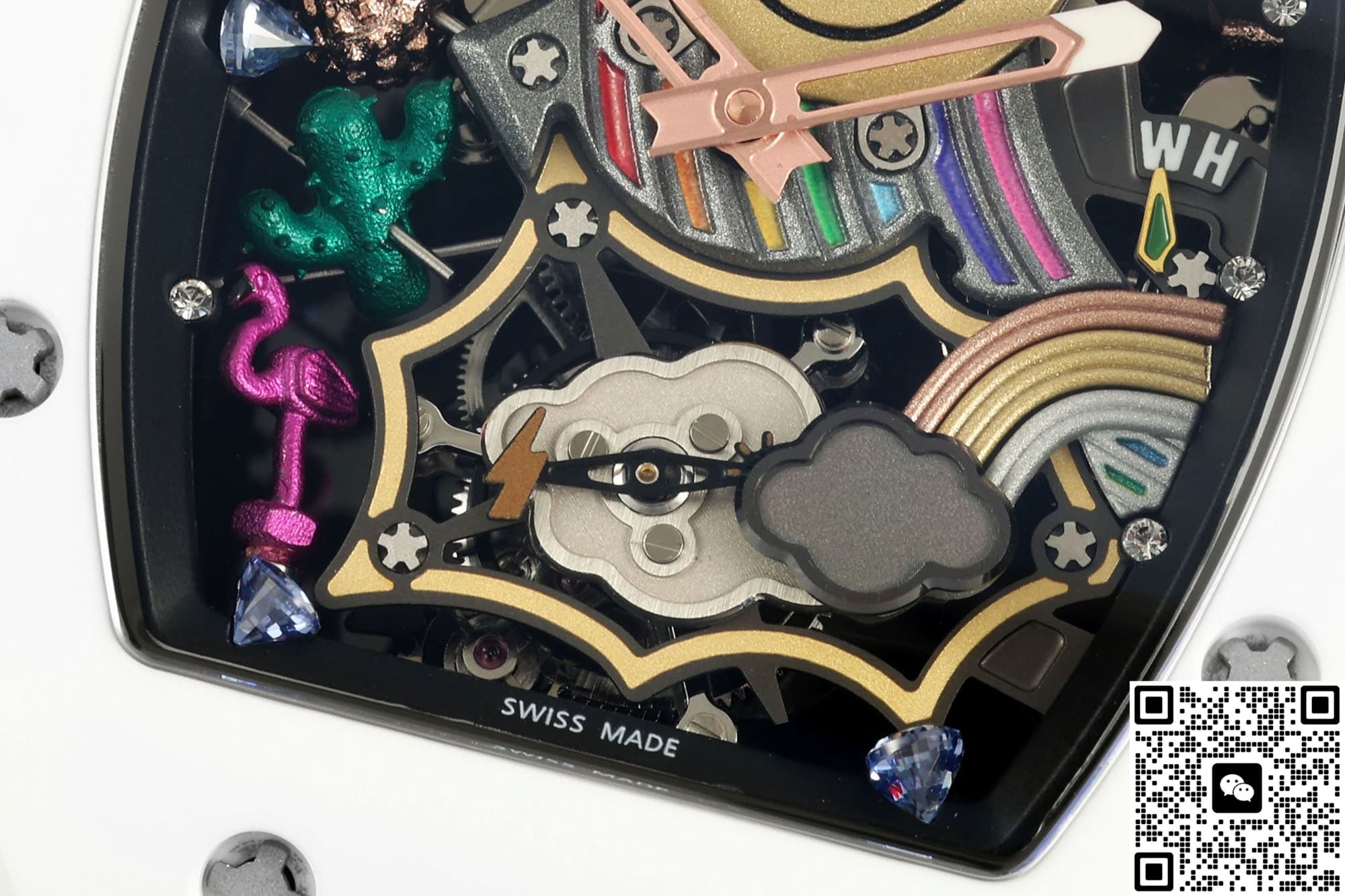这是目前性价比最高的笑脸陀版本,表盘中央有一枚直径约12MM的立体黄金色PVD笑脸,眉毛、眼睛、嘴角都是CNC再手工打磨,远看是卡通,近看有金属的棱角,笑脸的周围做悬浮派对布局,五点位置有小彩虹桥板、六点位隐藏式陀飞轮、三点位火烈鸟、仙人掌、鸡尾酒杯等等九组微雕,视觉看过去就像漂浮在镂空机芯上方一样,原版的味道非常浓郁,酒桶型的表壳上下层都是白色ATZ陶瓷,中层电镀18K红金,表冠顶部也做了一个笑脸浮雕,白金黄整体色彩搭配起来撞色效果非常明显,走在大街上自带焦点。可能有朋友担心自己手腕不太大戴起来会不会很奇怪,其实不会的,NEW工厂这款理查德米勒RM88款虽然也是和正品一样做的48.15×39.74MM尺寸,不过酒桶型的表壳本身就带有弧度,佩戴起来很贴手腕,搭配上织物橡胶结合的表带,16-19CM的腕围都完全可以完美的驾驭住它。