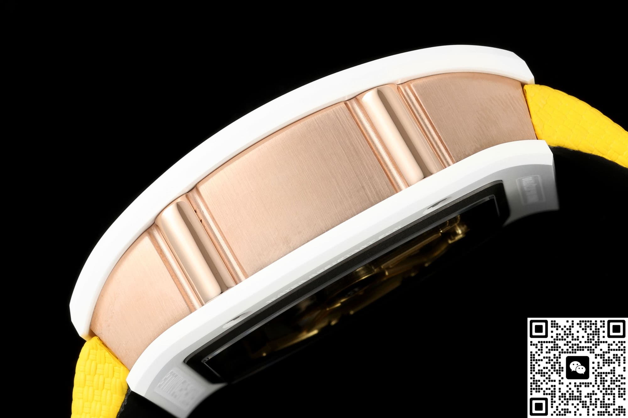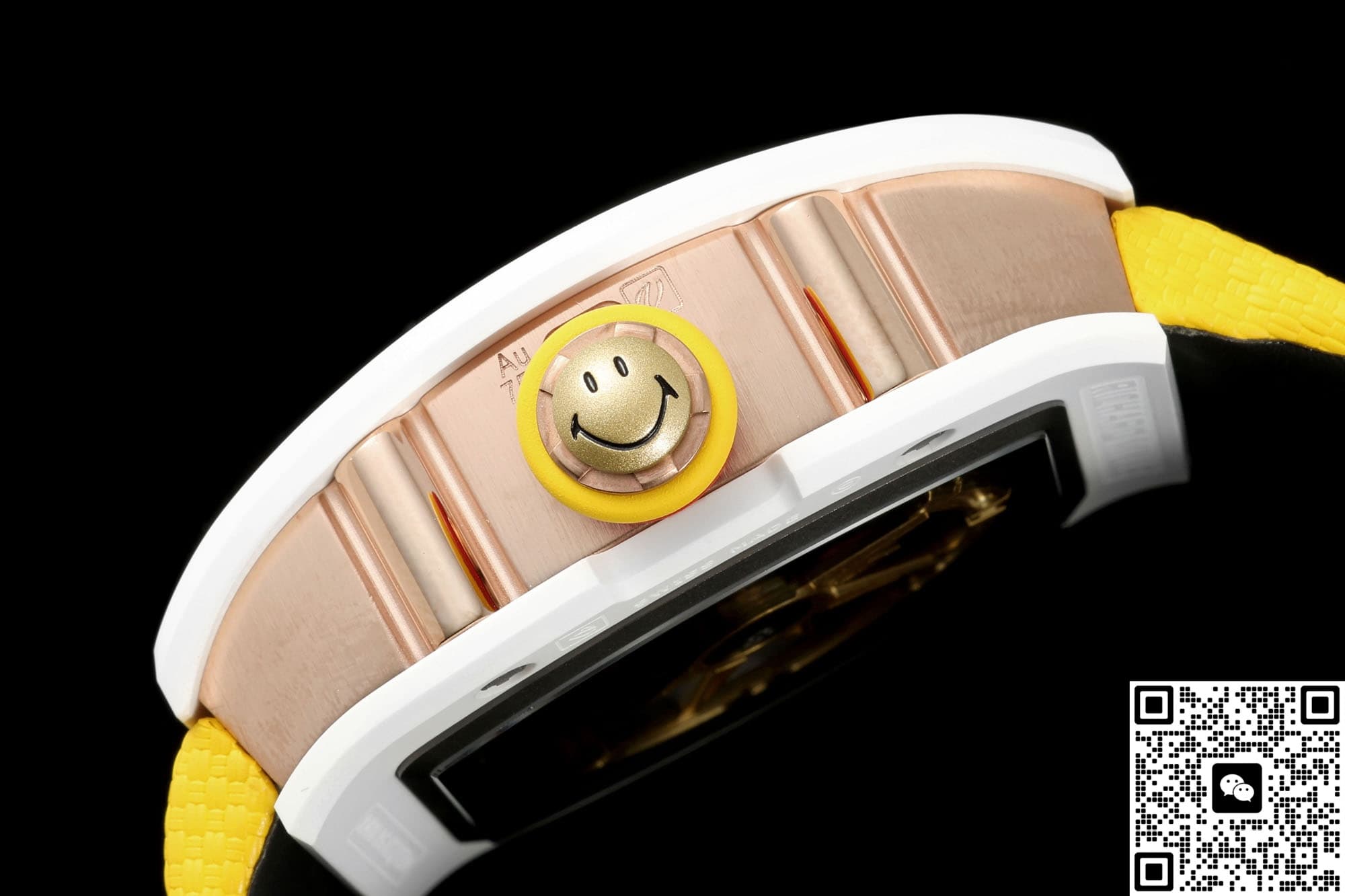 白色腕表并不罕见,不过真正的雪色在户外光和室内冷光之间会出现两极色差,NEW工厂5A级陀飞轮腕表表壳一共有三层结构,上下表壳全部使用ATZ白色陶瓷材质,这种材质使用氧化锆冷等静压而成,刀刮不留痕,但是摔碰就会碎,这也是这种材质的一个通病了;中层使用316L精钢材质作为底胚,厚度5微米18K红金,滚砂后进行手工抛光,颜色和正品一致,白色和金色的搭配也十分让人眼前一亮。表冠采用洋葱微弧轮廓,边缘做了十二道放射状凹槽,就算湿手或者带手套也非常方便拧动,表冠顶部特意镶嵌了一枚笑脸浮雕,就算从侧面看也跟正品达到了超高的相似度。手表前后都使用蓝宝石材质作为镜面,内层涂有防眩膜,上下蓝宝石加陶瓷的方案让整表透光度达到65%以上,是镂空概念可以被一眼看懂的关键,很适合那些喜欢看陀飞轮内部运转的朋友们,而且硬度很高,实测下可以承受3米跌落冲击,不过大家可要注意了,镜面抗摔不是代表整表都抗摔,一旦摔了,镜面是没事,表壳可要像我的心一样碎了。表带使用的是织物橡胶组合材质表带,外层是黄色尼龙织物,内衬氟橡胶,夏季佩戴很透气不会闷手腕,快拆弯头15秒就可以完成一次更换,带腻味了更换也非常方便。表扣为陶瓷和钛组合折叠扣,不仅轻,而且防过敏。NEW厂高仿手表理查德米勒RM88陶瓷表壳抗刮不褪色,镂空立体笑脸还原度和辨识度都非常高,非常值得购买。
