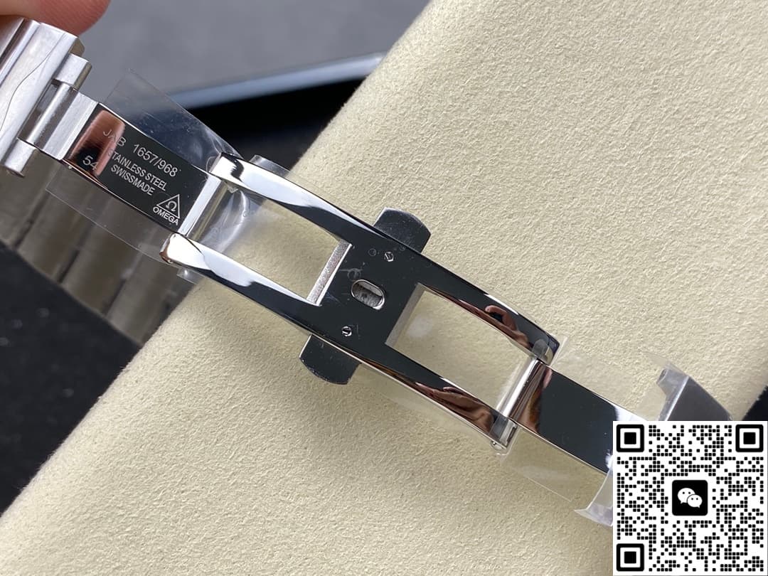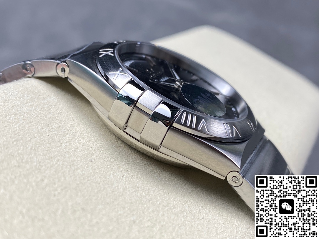 OM工厂这枚欧米茄把星座系列里最招牌的曼哈顿基因拆成两层,远观是冷峻的全钢单色,近看却又被黑盘里跳动的银辉吸引,38MM的直径卡在36和41之间的黄金社交尺寸,就算穿着西装袖口也可以轻松滑入,镜面抛光的四个拖爪完美的扣在表圈上,表圈上的罗马数字和表壳侧面的铭文都1:1复刻正品,OM工厂欧米茄克隆版本最大的魅力,就是能以正品零头左右的价格,提供近乎乱真的视觉和触感。