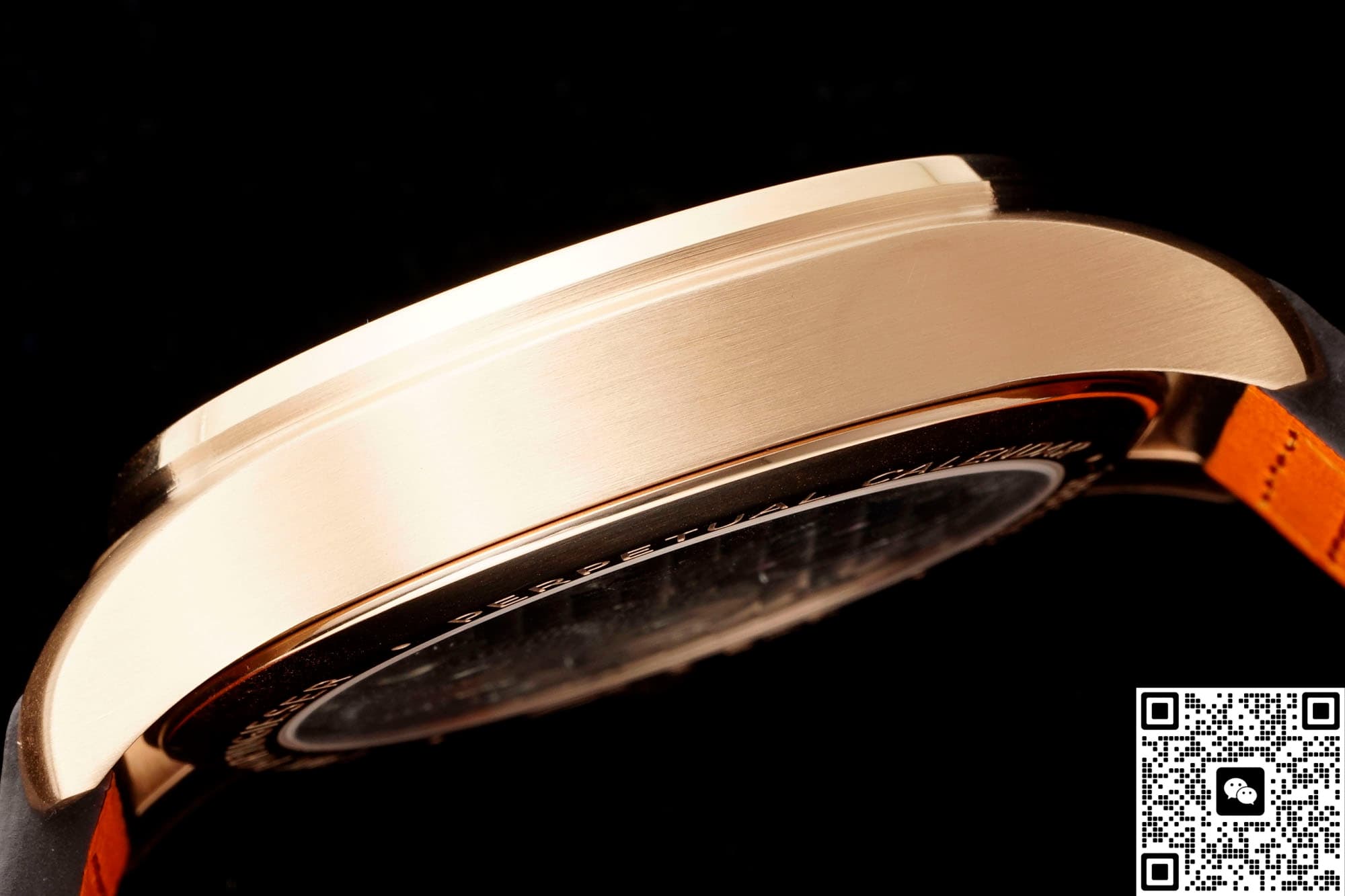 既然是真陀飞轮,那这款RMS工厂万国陀飞轮机芯怎么样呢?RMS工厂选择搭载自制的82905陀飞轮克隆机芯,这是一种同轴飞行式的真实陀飞轮结构,框架360°旋转,擒纵叉、擒纵轮和摆轮全部随着框架转动,属于机械式补偿机构,不是市面上常见的低端假飞轮装饰盘。RMS工厂用316L镀镍CNC铣出同样的三窗布局,陀飞轮框架使用黄铜镀铑,再手工精修刮出45°亮边,游丝采用的并不是和正品相同的Nivarox游丝,而是Elinvar游丝加四颗固定装饰的假螺丝。为了让陀飞轮转起来不会抖,它先车出笼框,再铣三根立柱,抛光倒角之后压入擒纵叉小宝是,动态平衡机去重后只剩下5微克偏心,转起来也不会抖,再把笼子装进底板,在手转测速60秒必须刚好转完一圈,差0.2秒都不算合格。RMS工厂目前把外观和功能都做到了和正品95%的相似度,陀飞轮功能也完全可以正常的运行,想体验陀飞轮的朋友们真的是赶上好时候了。RMS工厂高仿手表万国飞行员陀飞轮IW329502把几十万的天价打到普通人也可以够得着的价格,真陀飞轮在腕间不停的旋转,这不只是机械的奇迹,更是RMS工厂对于真陀飞轮的执着追求,这款手表日常佩戴或者通勤都非常合适,每一次精准的运转都像黑洞一般紧紧的吸引住你的目光,如果你也想体验这份专属于陀飞轮的魅力的话,RMS工厂万国陀飞轮绝对是非常值得考虑的选择。