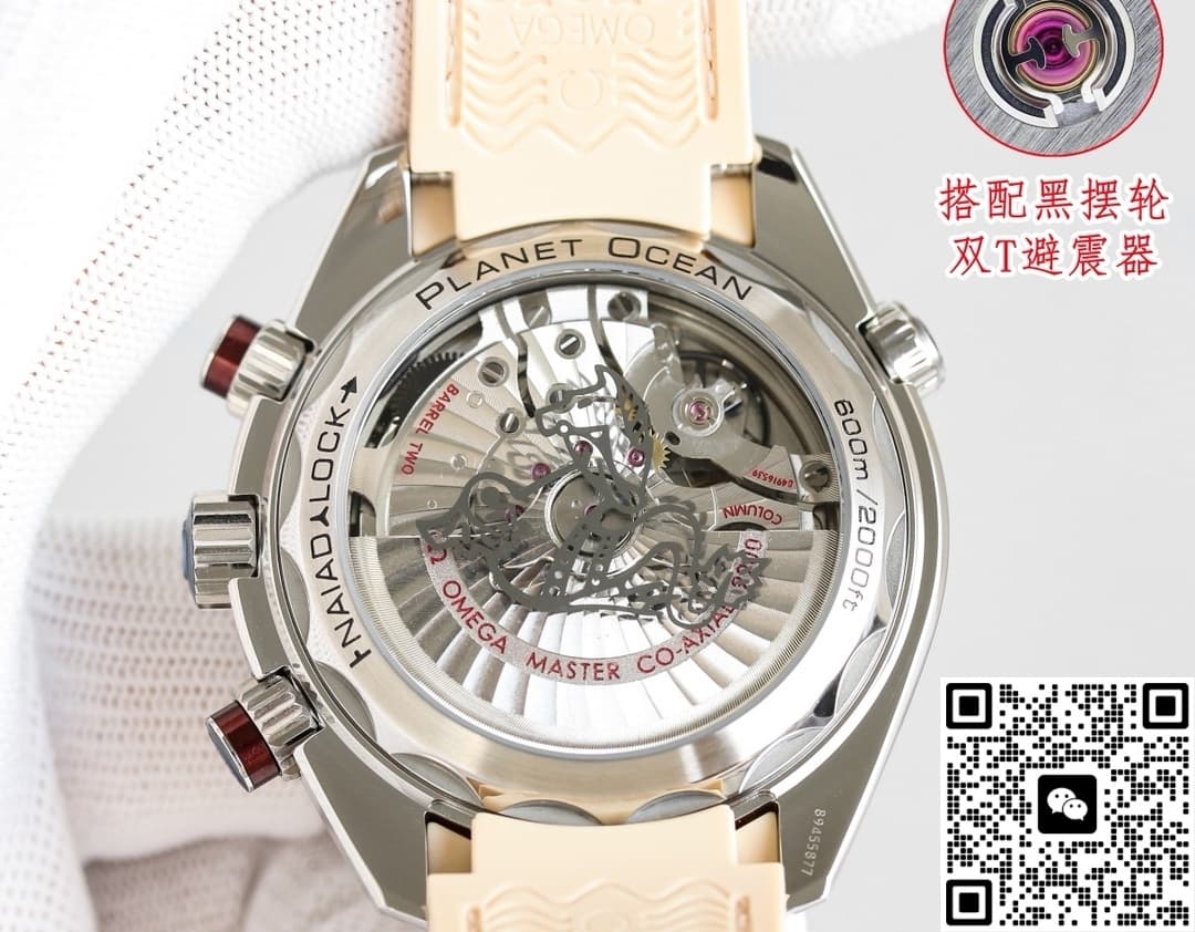 奶油米和棕色的配色也是海洋宇宙全系列里的独一份,既保留了专业潜水表的高辨识度,又比橙圈和红圈更加低调百搭,衬衫牛仔卫衣都能压得住,对于想靠一块表走天下的人来说,这种温柔军事风几乎不用思考搭配,随手戴上就能出门。而且600米防水和单向旋转表圈属于专业潜水规格,虽然大多数人不会去深浅,但是游泳、浮潜或者漂流完全没有压力。背透则是TVS工厂的另一大杀器,它把国产7750彻底换芯,重新排布传动系,让摆轮移到七点位,取消快慢针改成四颗砝码微调,夹板镀铑再加放射纹,自动陀也做成镂空波浪并填充黑漆,整体和正品9900机芯的背面布局达到95%以上的相似度,社交距离内也完全不怕被看穿。机芯加装纵轮和垂直离合,按钮手感很清脆,启动计时的时候也不再有咔哒巨响,复位干净利落,防磁方面给蓝钢游丝再覆硅层,日常手机音响堆在一起也不用担心受磁走时不准,而对于喜欢把表翻过来欣赏机芯运作的朋友们来说,这枚背透也足够解毒。
