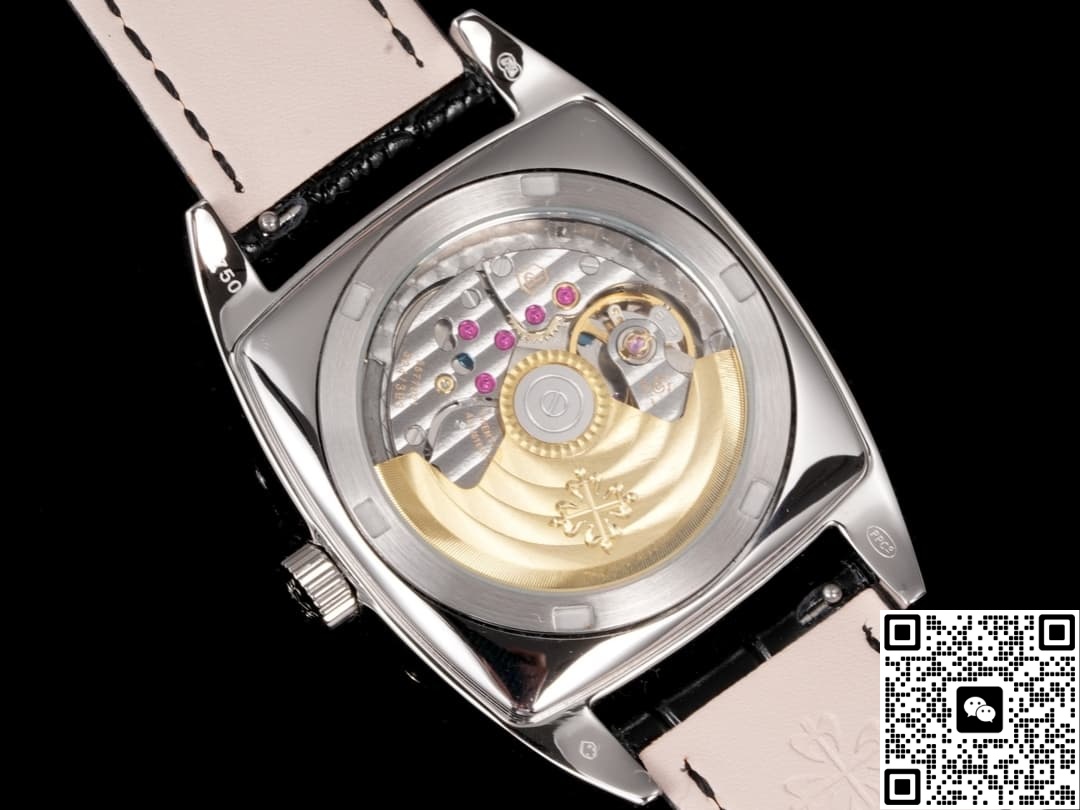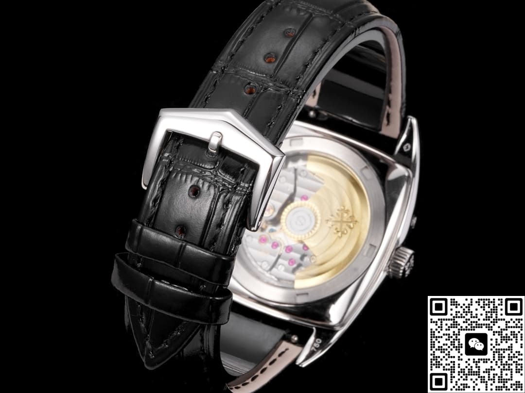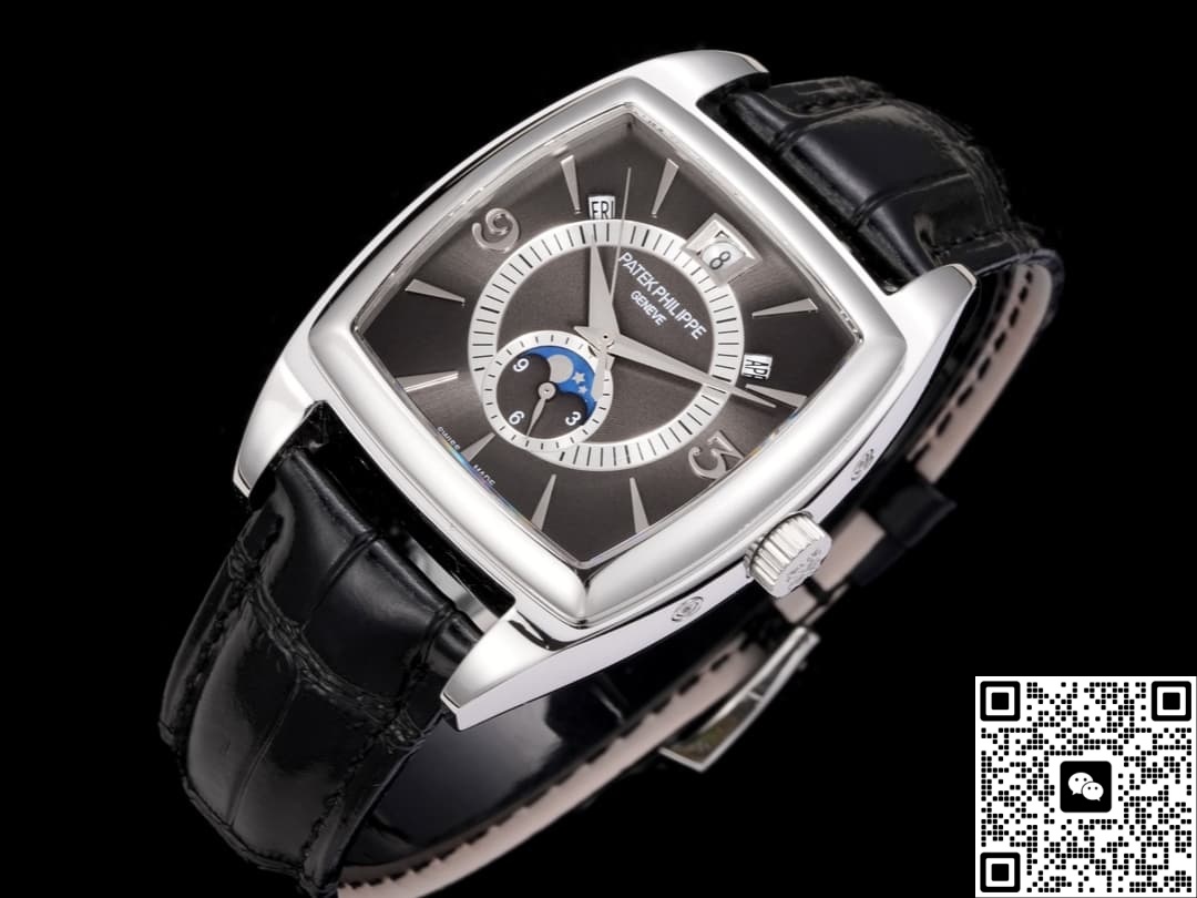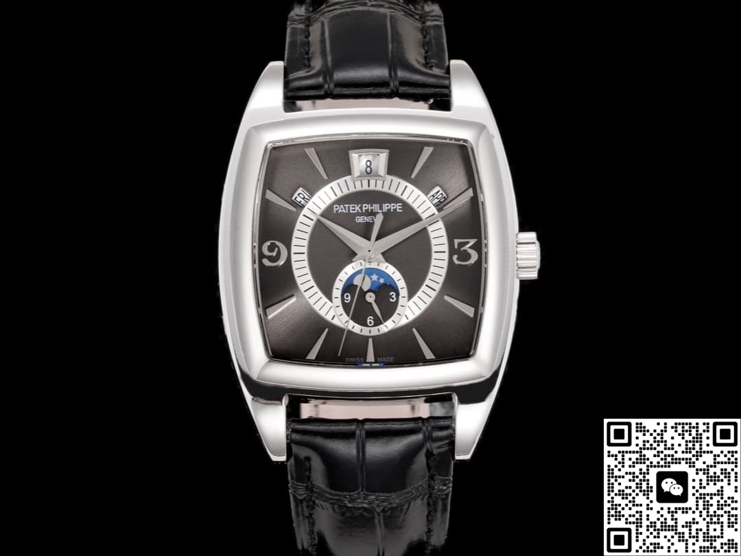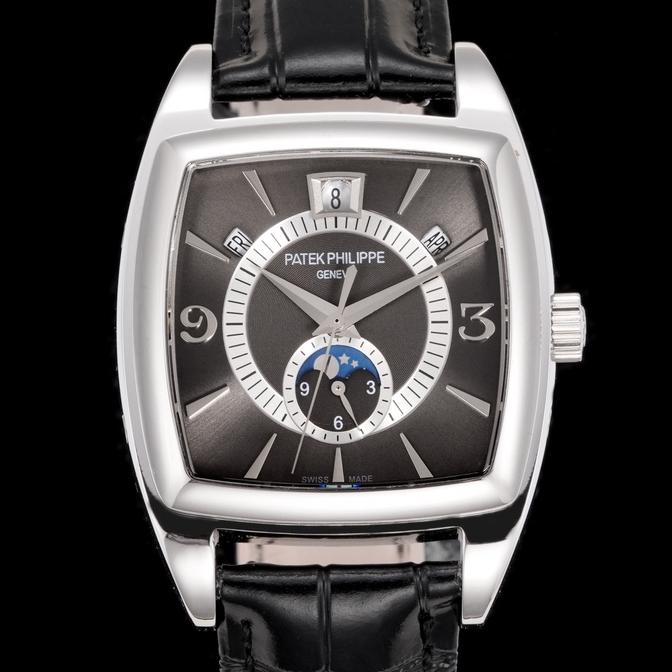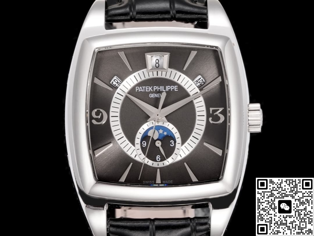 这款手表的表径为38×51毫米,表壳厚度为11.7毫米,可以说是尺寸比较大的一款手表,适合手腕尺寸比较粗的成年男性使用。它的表盘形状像是一个酒桶,镀了一层深灰色,质地哑光清透;银白色的锥形时标和阿拉伯数字时标镌刻在表盘上的最外圈,分钟刻度被单独用白色圆圈镶嵌在时标内;另在正下方又有个白色小套圈,这是嵌入了月相功能显示的子表盘;除此之外在整个表盘的正上方和相应位置的左右两侧分别安置了四边形的月份年历显示等等;加上整个表盘所配用的银白色锥形指针,共同组成了这一个美观协调又元素复杂的表盘设计。表圈和表耳也是同样的银白色,被打磨得十分光滑且有质感,表圈是贴合表盘的酒桶形状,而表耳维系着黑色的表带。除此之外,这款手表的表扣是折叠扣,可以让皮革表带妥帖地固定在佩戴者的手腕上,也方便对手表进行取戴。作为百达翡丽的一款高仿复杂计时功能系列手表,它最吸引人的地方无疑是所具备的功能——包括年历、月份、星期和日期显示,甚至还有一个特殊的月相功能。