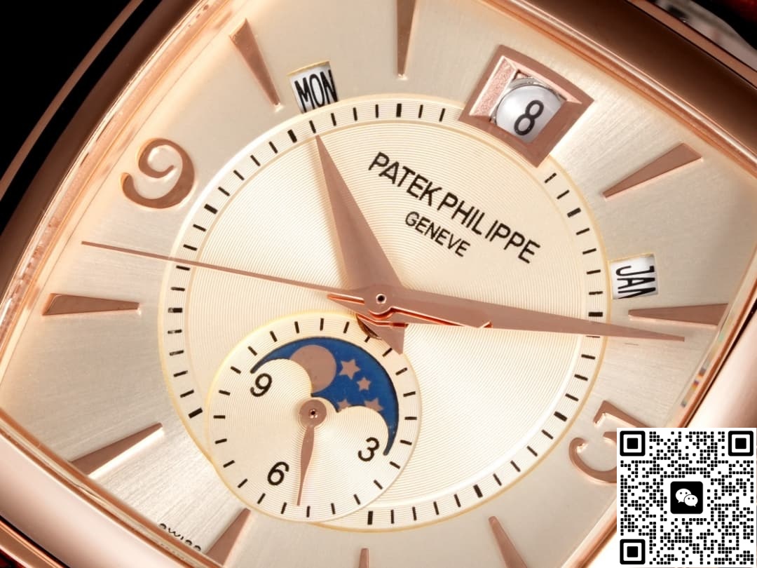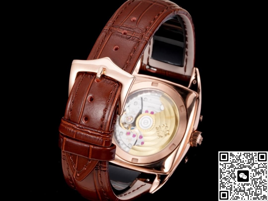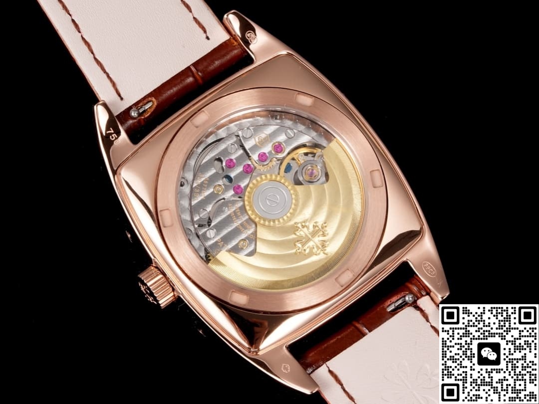 第一眼看见5135J-001,最容易被吸引的是它微微弯曲的酒桶轮廓。TW工厂在壳型上下足了慢功夫,从正面拉丝到侧身抛光,再到表耳和表带连接处几乎无断差的过渡,让金属的明暗层次随着手腕转动而流转,像老式镀金怀表那样带着一点暖光,却又不失现代感。玫瑰金的配色介于奢华和低调之间,既不会像黄金那样张扬,又不会像铂金那样冷淡,不管搭配衬衫还是毛衣都可以衬出沉稳的质感,让正装和休闲之间的界限变得模糊。复杂功能往往是高仿领域的难题,因为机芯空间、齿轮布局和调校手感都需要重新设计。TW工厂没有采取留壳换芯的取巧做法,而是把完整的年历模块做在自动上链系统上面,让星期、日历和月份真正联动。当月底时针跨国午夜,小窗里的数字就会敏捷的翻转,瞬跳节奏短促而清脆,在安静的夜里甚至可以听见机簧释放的轻响,给佩戴的人一种机械在呼吸的亲切感。月份显示隐藏在六点位置,青金蓝底搭配立体金月,就像把阴晴圆缺戴在手上;二十四小时盘则于中央时针同步,既可以在调校的时候区分上下午,也能让盘面多一份对称美。背透的设计也让机芯打磨一览无遗,TW工厂将自动陀整体镀金,并加入环状纹路,配合蓝钢螺丝和镀金夹板,在视觉上先声夺人;自动陀边缘的滚珠轴承做了降噪润饰,日常摆臂的时候几乎听不到哗哗声,只留下轻微的沙沙摩擦。夹板上的鱼鳞纹和日内瓦纹也并不是简单的印花,而是通过小尺寸CNC和手工打磨交替完成,光线扫过的时候可以看到细腻的银光,和玫瑰金陀面形成冷暖对比,有一种被克制的华丽感。