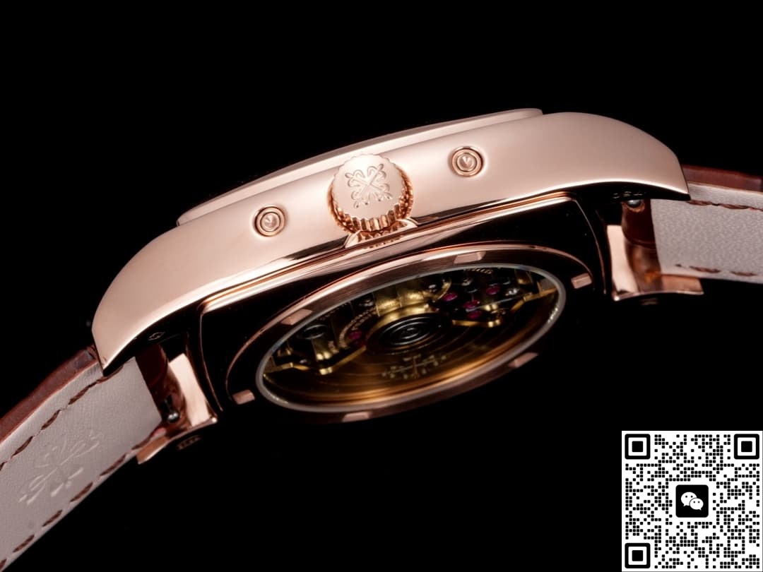 TW工厂百达翡丽高仿手表对比正品怎么样呢?它延续了原版的黄金比例,酒桶长度落在51毫米,宽度却完美的控制在38毫米,厚度也被压缩到能够轻松滑进衬衫袖口的程度,对于亚洲手腕来说,这样的体量既不会显得浮夸,又不会因为过小而牺牲读时清晰度。镜面采用微拱蓝宝石材质,边缘和金属接缝精密,侧面观看表盘刻度会微微放大,带来老式亚克力镜面的放大味道,却又具备了现代蓝宝石的防刮优势。盘面的银乳色放射纹同样值得细品,中心颗粒细腻,向外逐渐舒展,和玫瑰金指针形成柔和的反差感,在不同光线下呈现米白、暖银甚至浅香槟的色泽变化,为简单看一眼时间这件小时增添了仪式感。皮带的选择同样体现了TW工厂的诚意,它搭配了一条深棕鳄鱼皮表带,背面贴有防汗涂层,夏天佩戴也不会轻易闷湿,皮料经过半哑光处理,视觉上更接近佩戴多年的旧化质感,配合玫瑰金针扣,色调统一温润,非常好看。