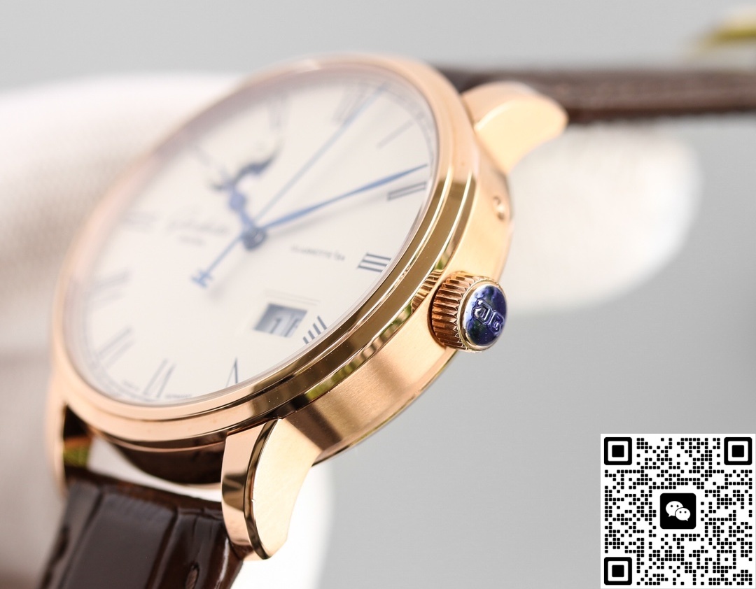 这款手表有多还原正品呢?不止是说要外型还原,手表的使用手感等最好也要还原。尤其是对于在外型上有比较高要求的表友来说,外型的还原度必须要非常高。只是用肉眼去观察,可以发现这款手表的外型和正品是一模一样的,这对于关注这款手表外型的表友来说是个好消息。V9工厂运用娴熟的技艺和精湛的复刻技术来制作出这款手表,绝对不只是为了表面上简单的仿制。探寻了手表的外形,我们接着来探寻手表的内部。表友们都知道,一款手表最重要的零件就是机芯,而手表的使用体验很大程度上和机芯挂钩。这款手表使用的机芯是36-24克隆机芯。这款机芯的型号和正品相同,展现出来的性能也高度相似,十分还原正品的使用体验。不过这款手表也有不那么还原的地方,那就是手表使用的材质。正品使用的是贵金属,V9工厂的同款手表不可能按照正品的材质去制作,因为这样的成本实在是太高了。但是好在这款手表的表带同正品一样,都是鳄鱼皮表带,这说明它们的佩戴手感都是一样的。除此之外,这款手表还有着大日历和月相功能。这两个功能的存在不仅让手表更加美观,也更加便利。