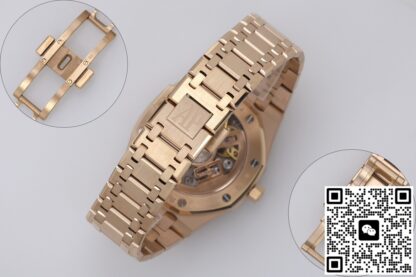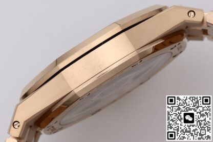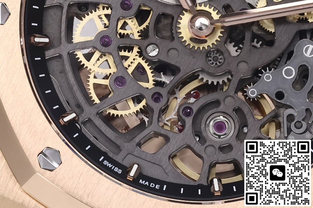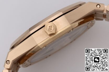 爱彼皇家橡树高仿手表玫瑰金色表圈延续了八边形对称、四象限双螺丝,这种设计在视觉上最稳,通过八颗六角螺丝与表壳固定,圈与表壳中框缝隙 ≤ 0.05 mm,指甲滑过无阶梯感。“三明治”表壳——表圈、中框、底盖三层,由 8 颗长螺丝贯穿锁紧,整表厚度仅为8.1mm。表底盖固定方式同样和表壳一样,八颗六角螺丝,确保了手表的密封性,旋入式的表冠采用六边形设计,顶部还镌刻AP字样的品牌标识,和表壳同样采用玫瑰金色,推入时先轻压→感到弹簧回力→再压到底旋紧,“先按后旋”。具备了50米的防水性,在日常生活中等场景基本免疫,下暴雨没带伞也能和你一起淋雨回家。ZF工厂爱彼皇家橡树高仿手表采用一体式链带,共 22 截,无“假耳”过渡,与表壳直接倒角衔接,和表壳同样采用手工缎面打磨等工艺处理,使金属表面能在不同光线角度下,呈现出或深邃闪耀的光影变化,提升了视觉层次感。玫瑰金色表带搭配AP字样折叠表扣,扣面刻“AUDEMARS PIGUET” 全拼,双按钮释放,扣臂带 15° 内折,闭合时会有清脆的“嗒嗒”两响。