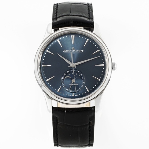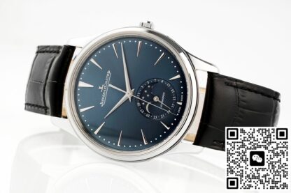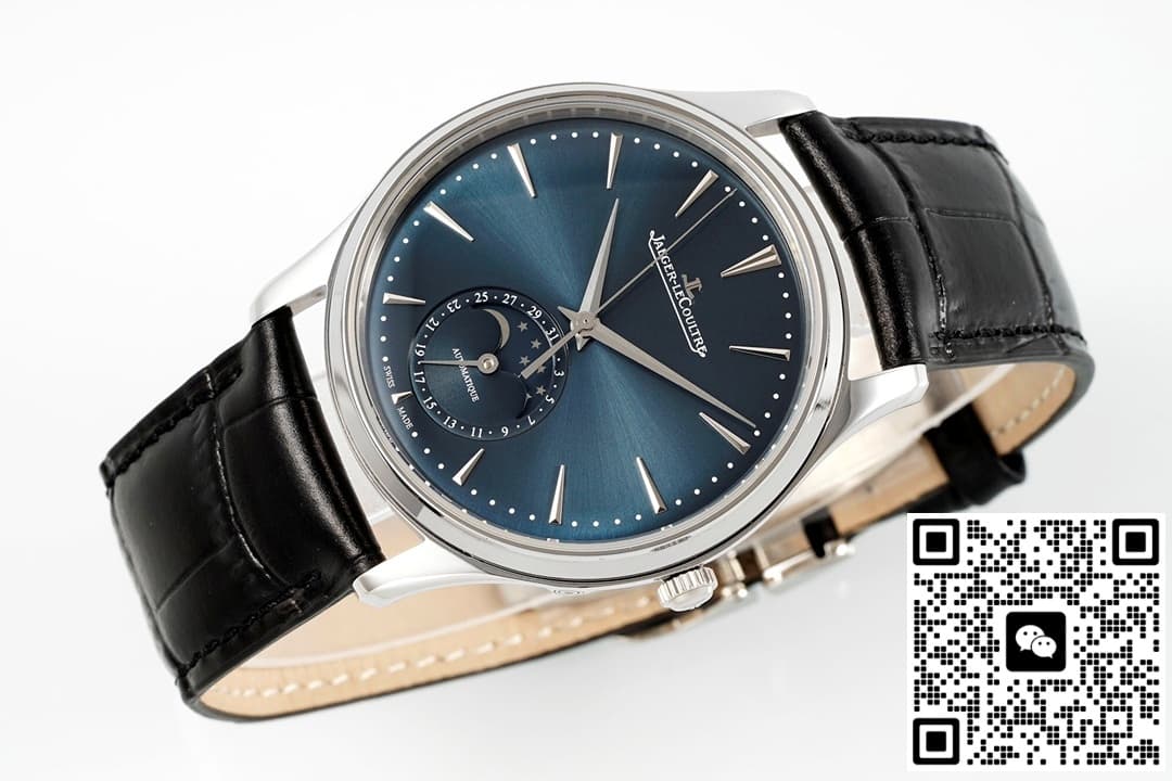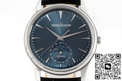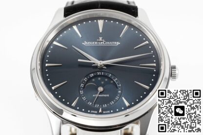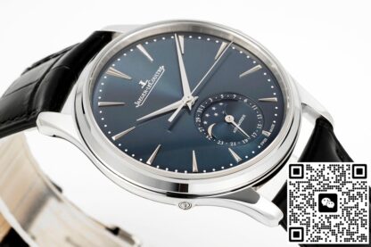 今天讲ZF工厂V2版高仿手表积家超薄大师Q1368480,腕表官网型号Q1368480,这款腕表最引人注目的就是深蓝色表盘,官方描述为”石油蓝”。盘面采用放射状拉丝工艺,在不同光线下呈现出独特的动态光影变化。时标采用锥形设计,指针则为经典的太子妃式指针,经过镀铑处理,确保清晰读时的同时也增添了精致感。