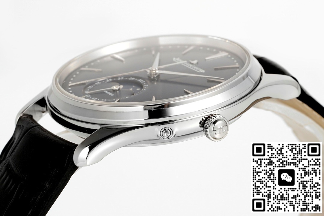 ZF工厂V2版积家超薄大师Q1368480高仿手表巧妙的把日历盘和月相功能结合在表盘六点位,外圈的日历稍微向下凹陷,形成层次感,偶数日期以圆点间隔,方便读取。ZF工厂V2版高仿积家手表在月相盘细节上再次升级,小表盘CD纹路清晰,不过拿显微放大镜在微距情况下看才能发现月相盘的月亮有点平整,没有原版更凹凸的感觉,不过现实生活中没人会在微距下仔细观察你的手表。表壳采用精钢材质,中层环形拉丝,表圈高亮抛光,底盖外圈垂直拉丝+倒角抛光,光影层次丰富,直径为39mm,两条侧面采用弧面抛光,主打的就是“显瘦”,为了追求9.3mm的超薄表壳厚度,ZF工厂V2版高仿手表积家超薄大师Q1368480精钢表冠采用普通推入式设计,处于原位未拔出时,顺时针旋转带动立轮与小钢轮,为发条补充动能;逆时针则空转,保护机芯。轻拨一下就是第一档,调校日历或者月相显示,再拨一下就停秒了,调校时分针,非常好上手操作。调校完再把表冠推回去,O形密封圈和表冠管内壁压紧密封,表冠管与中层一体车出,配双氟橡胶,隔绝了水汽、灰尘,确保50米的防水性能,能在日常生活中的涉水场景基本免疫。表冠顶部浮雕JL字母,增强了品牌辨识度,外圈做环形拉丝,侧面抛光,形成明暗光线对比。